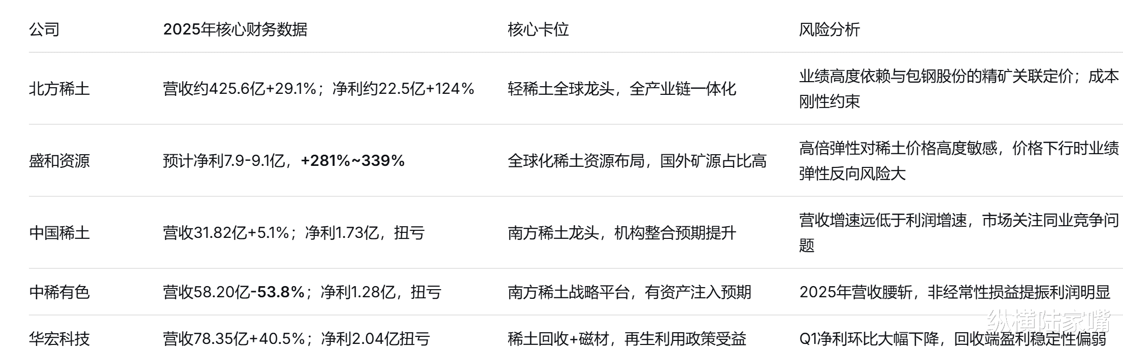 核心风险: 盛和资源是一把“双面刃”。利润弹性是五家中最大的,但价格波动的风险同样被放大——一旦稀土价格阶段性回落,业绩弹性会立刻反向转为收缩风险。海外矿山运营面临东道国政策不确定性,如资源税调整、出口许可变动等均可能影响供给节奏。从2025年三季报数据看,扩张的节奏依赖于稀土产品同步上升的定价空间。