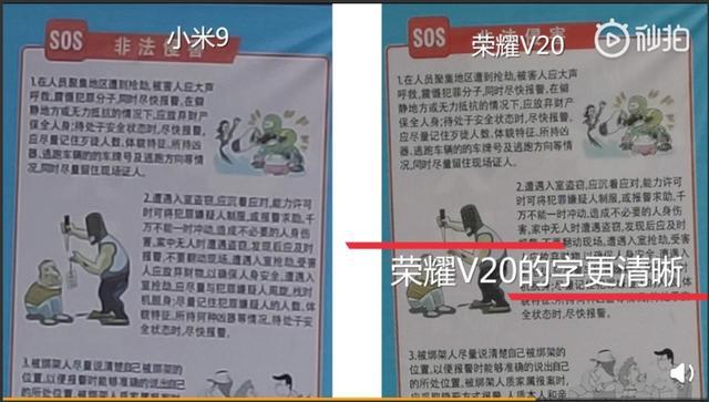 通过对比可以清楚看到。荣耀V20的文字清晰可辨,即便是比较复杂的文字,也没有出现笔画粘连的情况,而小米则出现了肉眼可见的文字模糊现象。