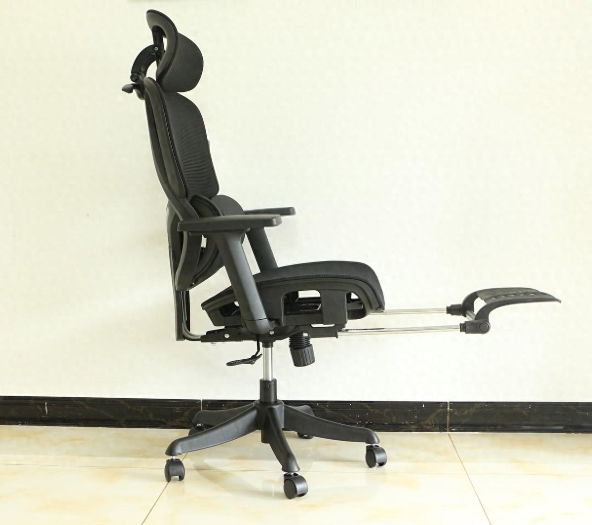 调节表现:调节功能全面,适配办公与休息场景。扶手调节可与椅背后仰联动,贴合身体姿态变化;靠背后仰最大角度约150度,搭配隐藏式伸缩脚踏,方便短暂小憩。头枕支持多角度旋转,能适配不同颈部姿态。缺点是仅两档锁定,角度跨度略大,难以找到更精准的休息角度。