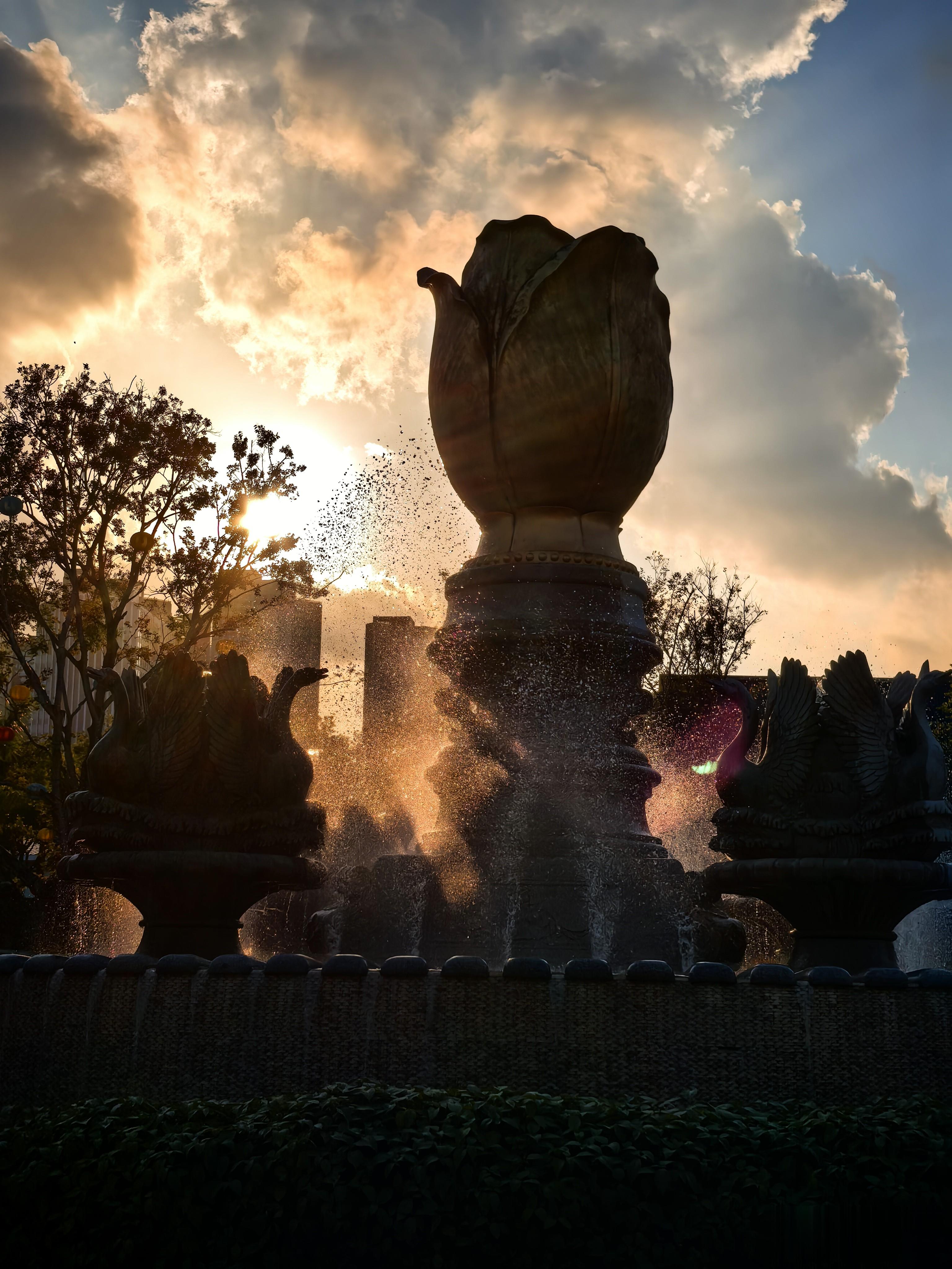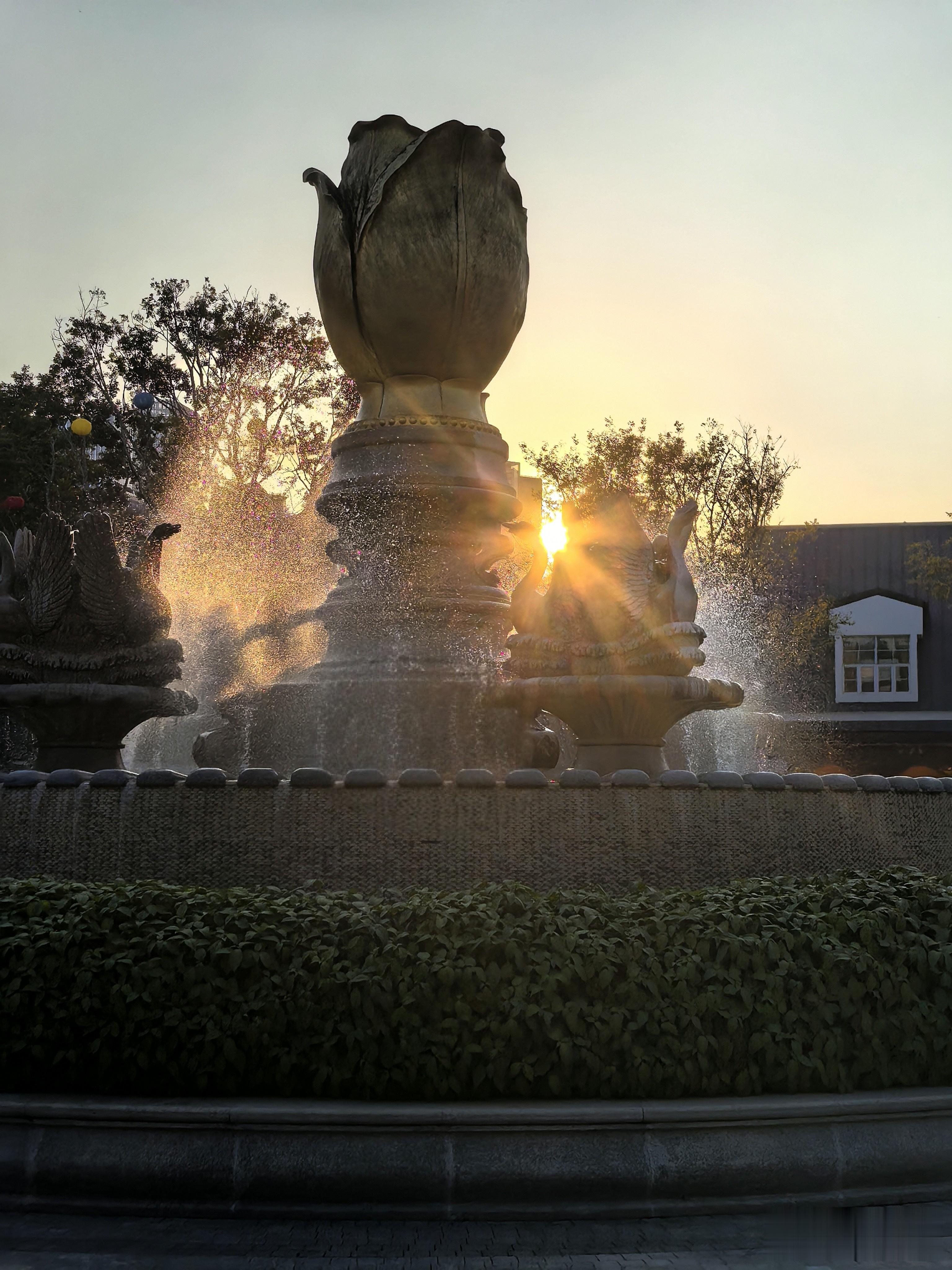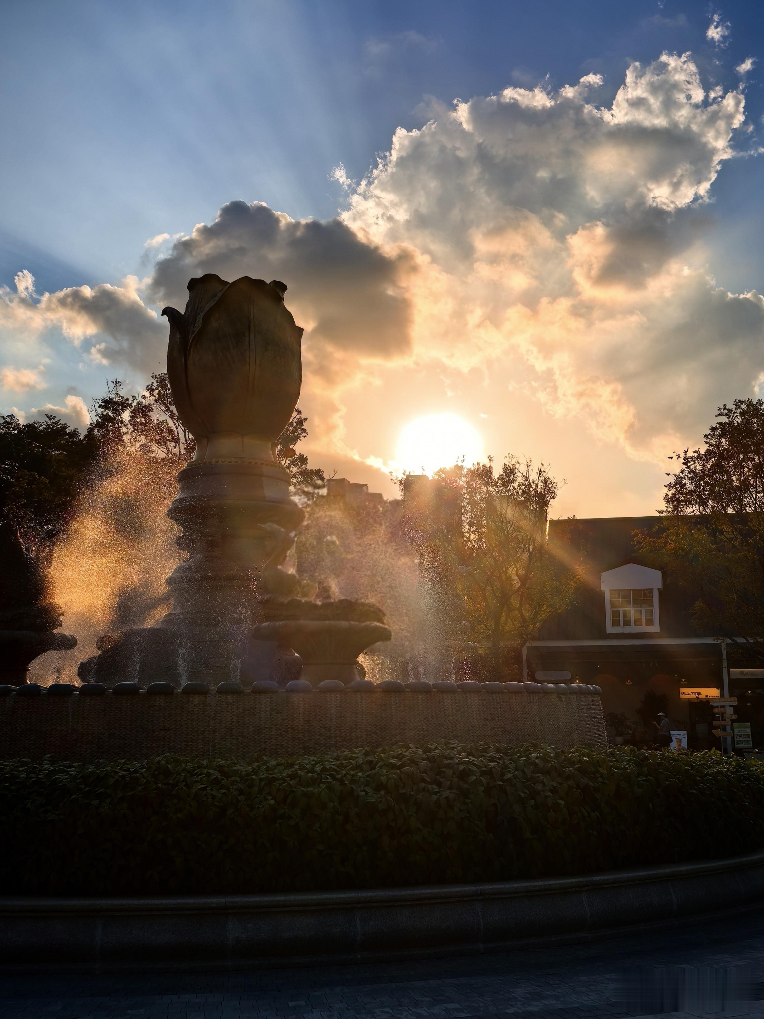 深绿色的铁艺拱门顶端,挂着一枚金橙渐变的球体,像是把黄昏揉碎了塑成月轮。喷泉边,金色的郁金香花朵水幕正翻涌,天鹅引颈水珠飞溅,应和着游人的轻笑。