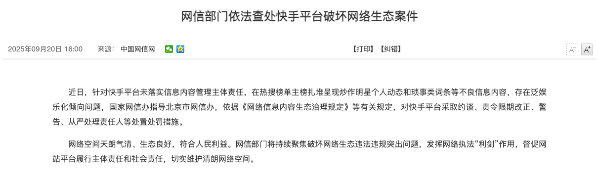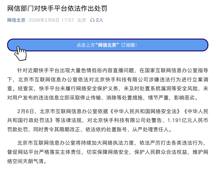 2026年2月6日,网信北京发文称,因存在大量色情低俗内容直播问题,北京快手科技有限公司(快手)被北京市互联网信息办公室处警告、1.191亿元罚款处罚,同时责令其限期改正、依法依约处置账号、从严处理责任人。