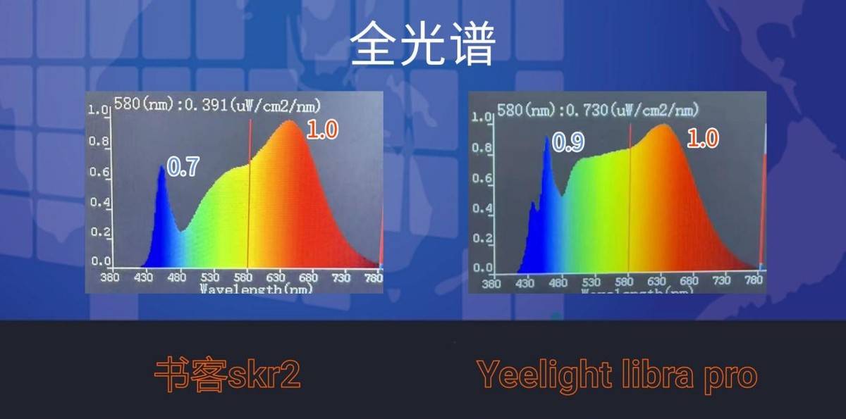 Yeelight Libra Pro的蓝光数值约在0.9,属于比较高蓝光,但红光占比相对充足,能对缓解长时间用眼疲劳也有一定帮助,但效果会比较一般。
