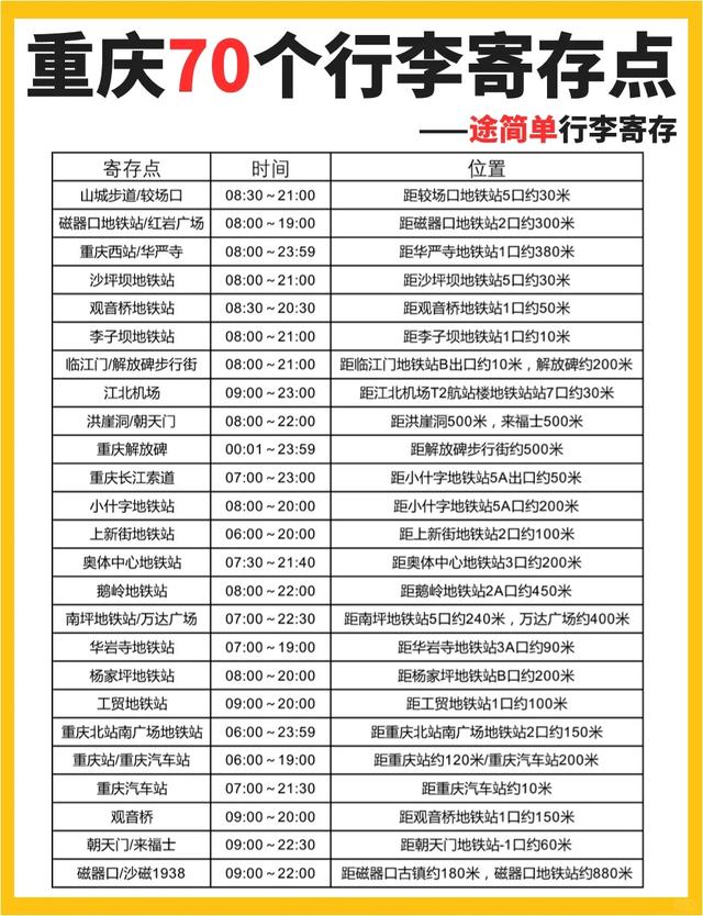 一、在“途简单”,重庆北站有行李寄存的地方,行李箱和背包都可以寄存,背包5元/天,行李箱10元/天。• 可过夜、专人看管、多天寄存、大件行李也可寄存-⭕️重庆北站有8个寄存点。全国160多个城市都有寄存点。
