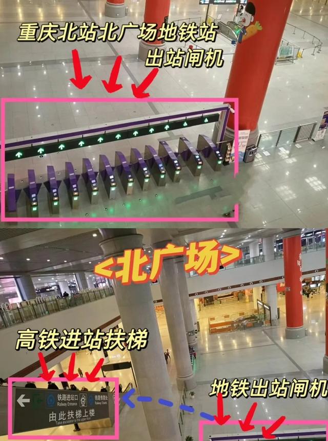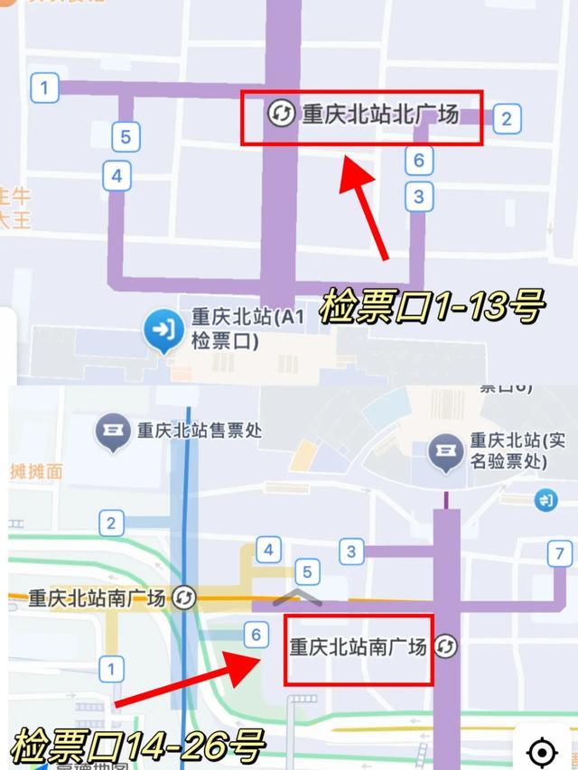 ⚠️重庆北站有南广场和北广场,南北广场互通⭕️北广场:1-13号口检票更快!地铁4号/10号线⭕️南广场:14-26号口检票更快!地铁3号/10号/环线❗检票口数字大,选南广场,数字小选北广场-✅铁路共有7个出入口:▶1号口是公交站和长途汽车站▶2号口是南广场售票大厅▶4/6号口是南广场地面站前广场-✅进站攻略➡南广场,从2号4号口出轻轨站,轻轨出口就是南2进站口入口,跟着指示牌前往进站口,上2次扶梯就到候车厅了➡北广场,轻轨出来就可以看到铁路进站口了,上扶梯跟着指示就很快到进站口了