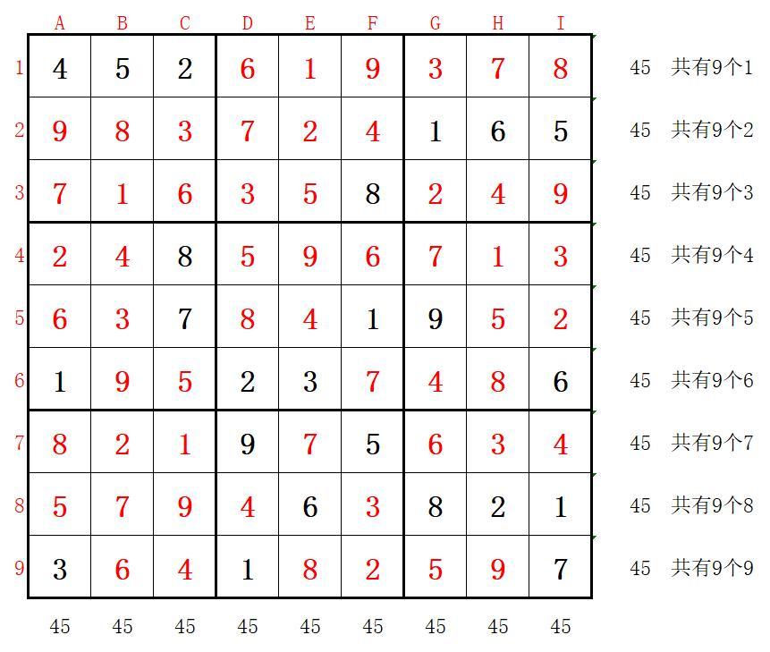 验证结果:当横、竖、小宫中相加的和均为45时,且1~9这9个数字均使用9次,就表明填写数字准确。