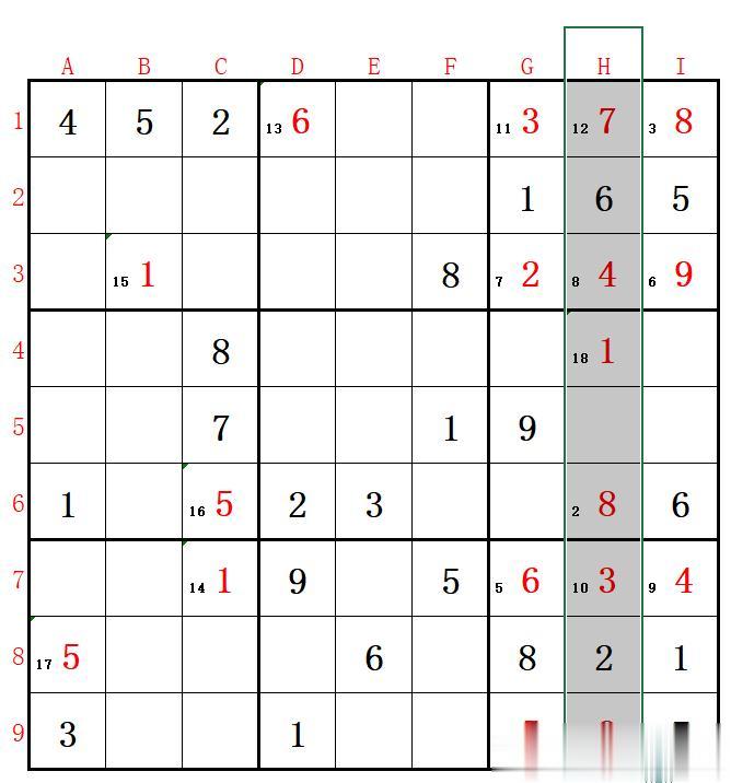 6、在G1~I3小宫中,G列的G5和H列的H9格中已有9,故在G1~I3小宫中,9只能填在I3格;