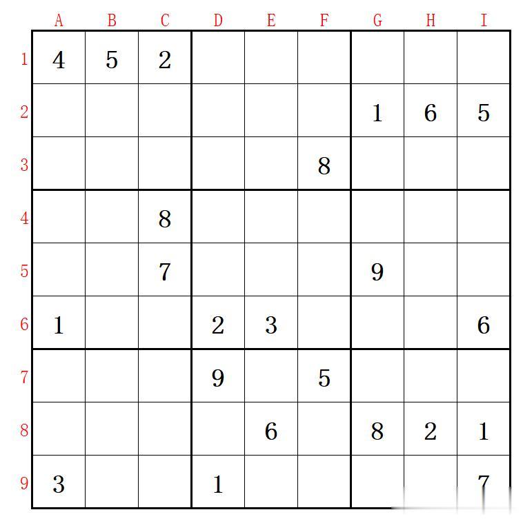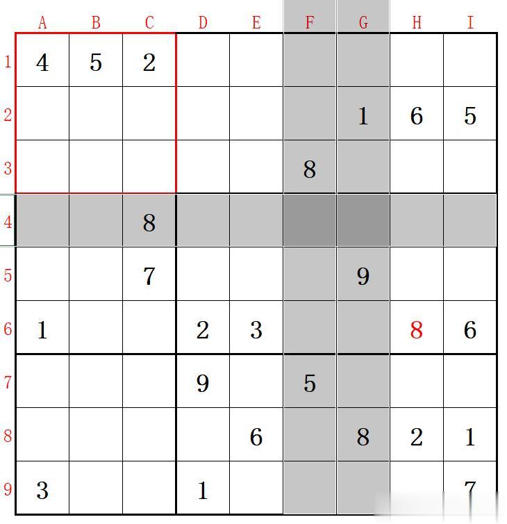 我们称唯一的那个4所在的方格为A1格;G列第5行那个9所在的方格为G5格;D列第7行那个9所在的方格为D7格;