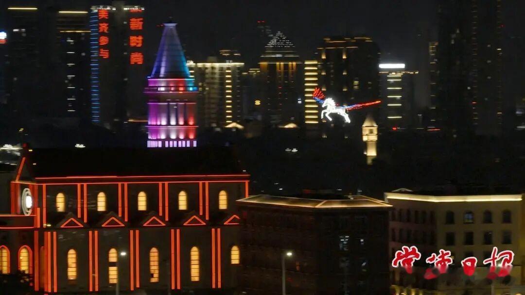 正月初三晚,春秋广场被里三层外三层的观众围得水泄不通。“哇——飞起来了!”随着人群中一阵惊呼,“天马飞春”网红高空飞马秀震撼开场。腾空而起的“天马”在夜空划出优美弧线,与璀璨冷烟花瀑布梦幻交织,金色流光如星河倾泻而下。手机屏幕争相举起,游客们纷纷按下快门键,“太震撼了,朋友圈被刷屏了!”一位年轻游客举着手机兴奋地喊道。