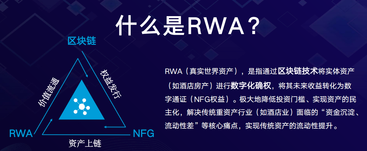 什么是RWA?资产数字化的破局钥匙RWA(真实世界资产)通证化是通过区块链技术将酒店资产数字化,未来收益转化为数字权益(NFG)。简单说,就是让酒店资产可拆分、可交易、可流通。