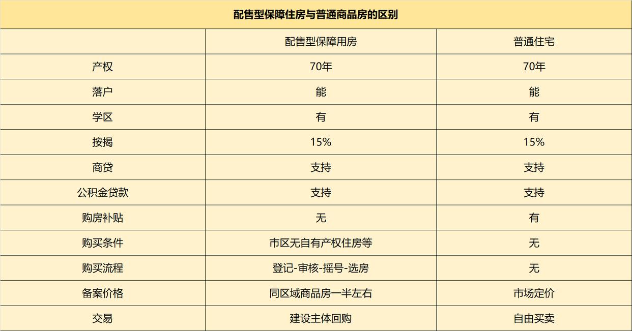 和普通商品房相比,配售型保障用房的权益是一样的,产权70年、能落户、有学区、能按揭、能商贷/公积金贷款,区别主要在于购买条件、购买流程和二手房交易上。