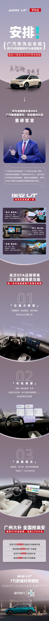 近日,以“跃升行业智能化”为主题的华为全联接大会2025在上海隆重召开,大会上,广汽集团董事长、总经理冯兴亚现场宣布:“广汽携手华为共同研发的‘广汽华为云车机’技术,将全球率先搭载在埃安UT车型上,并于9月底开始陆续OTA全量推送,除新车将全面搭载外,所有埃安UT老车主也都可以同步免费享受本次升级。可以说,面向未来,AI将成为广汽与华为深化合作的全新基石。”