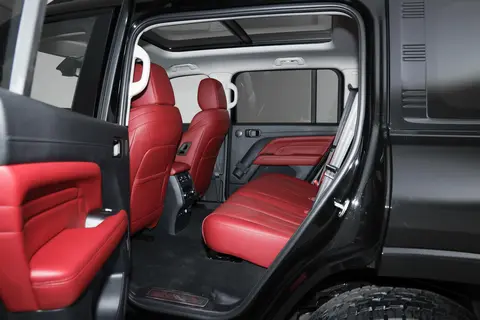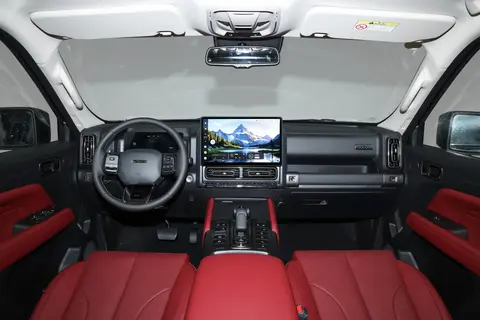 哈弗H9的内饰采用的是T字型的设计布局,整体的风格与外观一样硬朗,黑红色的内饰配色增添了一定的色彩感,车厢内采用了大量的皮质进行包覆,使其手能够触摸到的地方十分细腻,三幅式的多功能方向盘尺寸稍微有些大,采用的是皮质的材质,并配备了换挡和加热功能,10.25英寸的全液晶仪表盘分辨率较高,可查看行车信息较为丰富,中控台则搭载了一块14.6英寸的液晶大屏,智能化表现几乎是和领克09保持在同一个水平,在中控屏的下方还配备了一排用于操作空调系统的实体按键,对于这种硬派越野车型来讲,在驾驶过程中盲操会比较方便,另外,另外,车内的充电接口非常多,挡把前方配备了手机无线充电板,还带有2个USB/Type-C的多媒体接口,除此之外,车厢内还配备了110V/220V/230V的电源插座和行李舱12V电源接口等等,能够满足各种专业越野设备的补电需求。