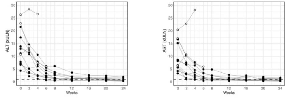 在临床试验中,12名新诊断的AIH患者接受了为期24周的英夫利昔单抗治疗。结果显示,2名患者在第24周达到了完全的生化缓解(ALT和AST正常化),所有患者的转氨酶水平显著下降。此外,英夫利昔单抗治疗还显著降低了肝硬度,表明其在减少肝脏炎症和纤维化方面的有效性。