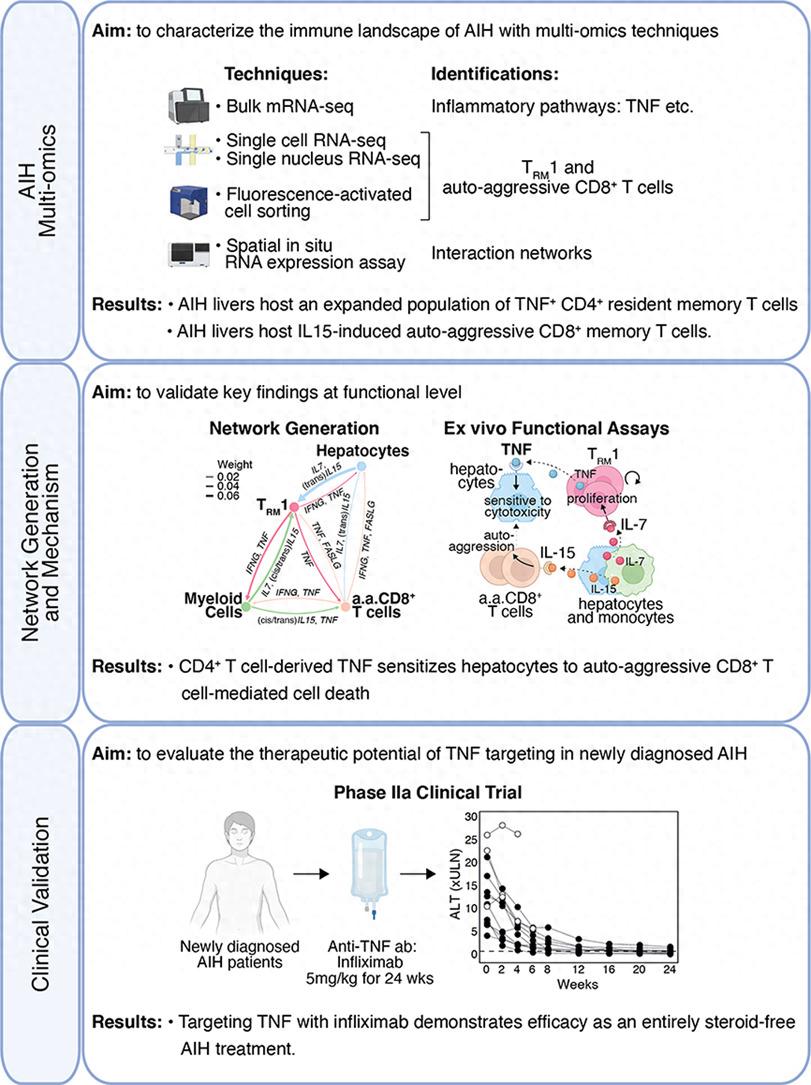 研究结论该项研究通过综合多组学技术和功能性实验向我们揭示了AIH的复杂免疫网络,并确认了TNF在其中的关键作用。有关抗TNF抗体英夫利昔单抗的临床试验结果表明,无类固醇治疗在AIH管理中具有良好的疗效和安全性。未来的研究将进一步探索这些发现的临床应用,以期改善AIH患者的治疗效果和生活质量。