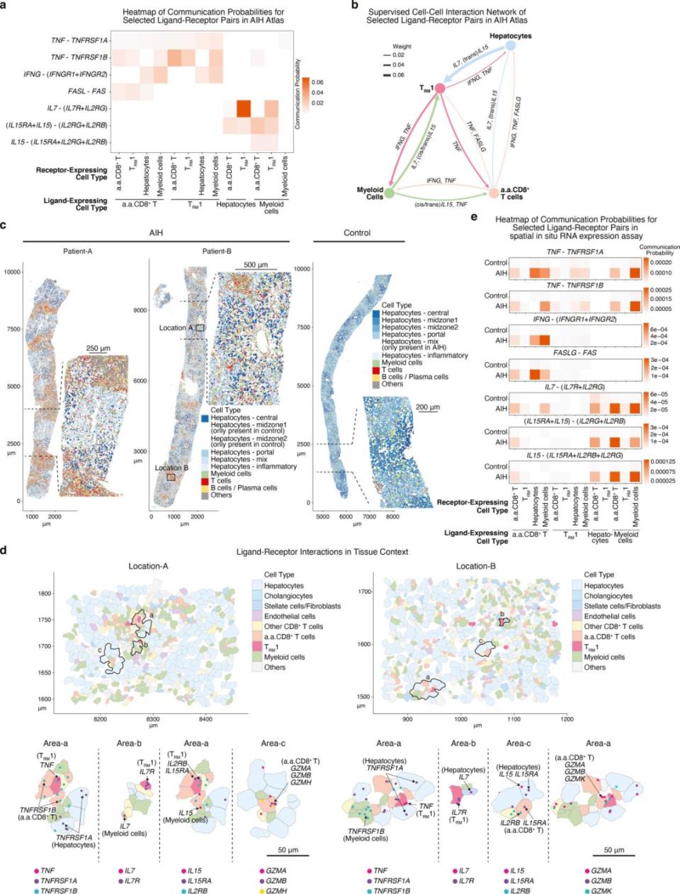 图2. AIH肝脏中TRM1、a.a.CD8⁺ T细胞、髓系细胞和肝细胞之间的相互作用网络