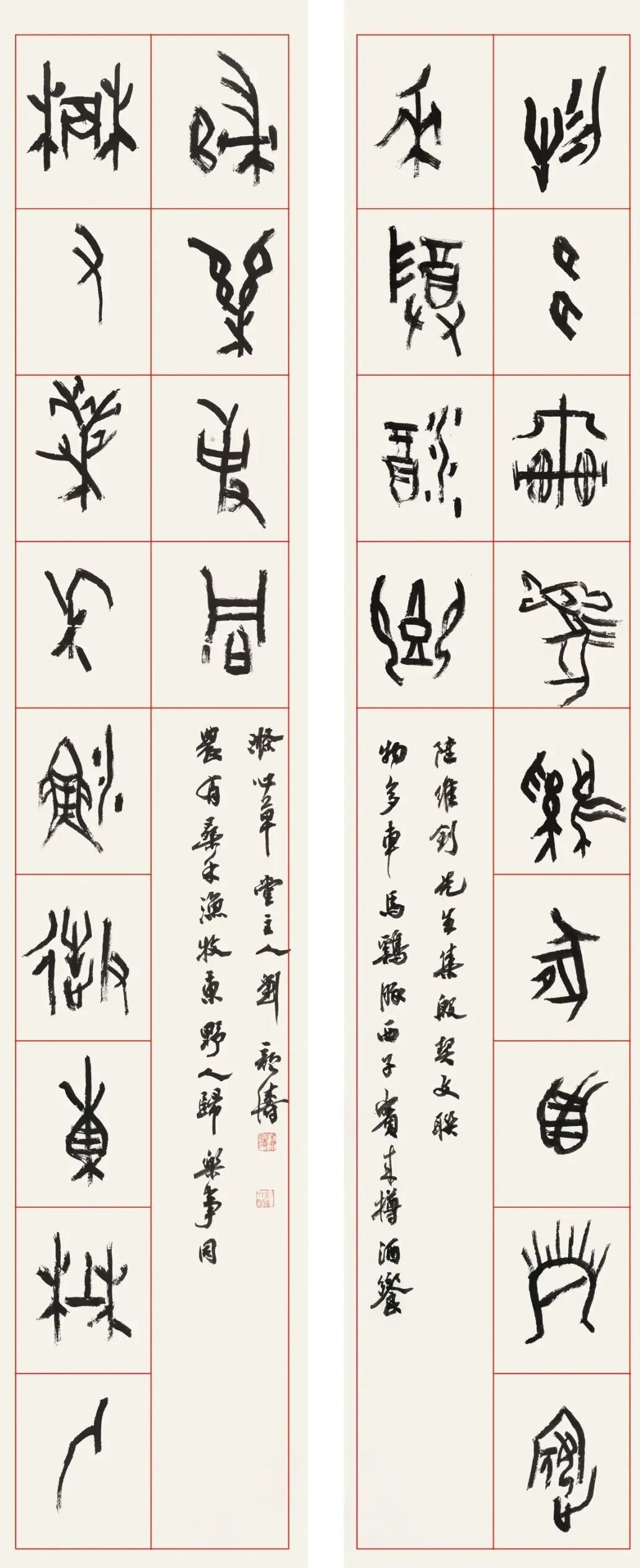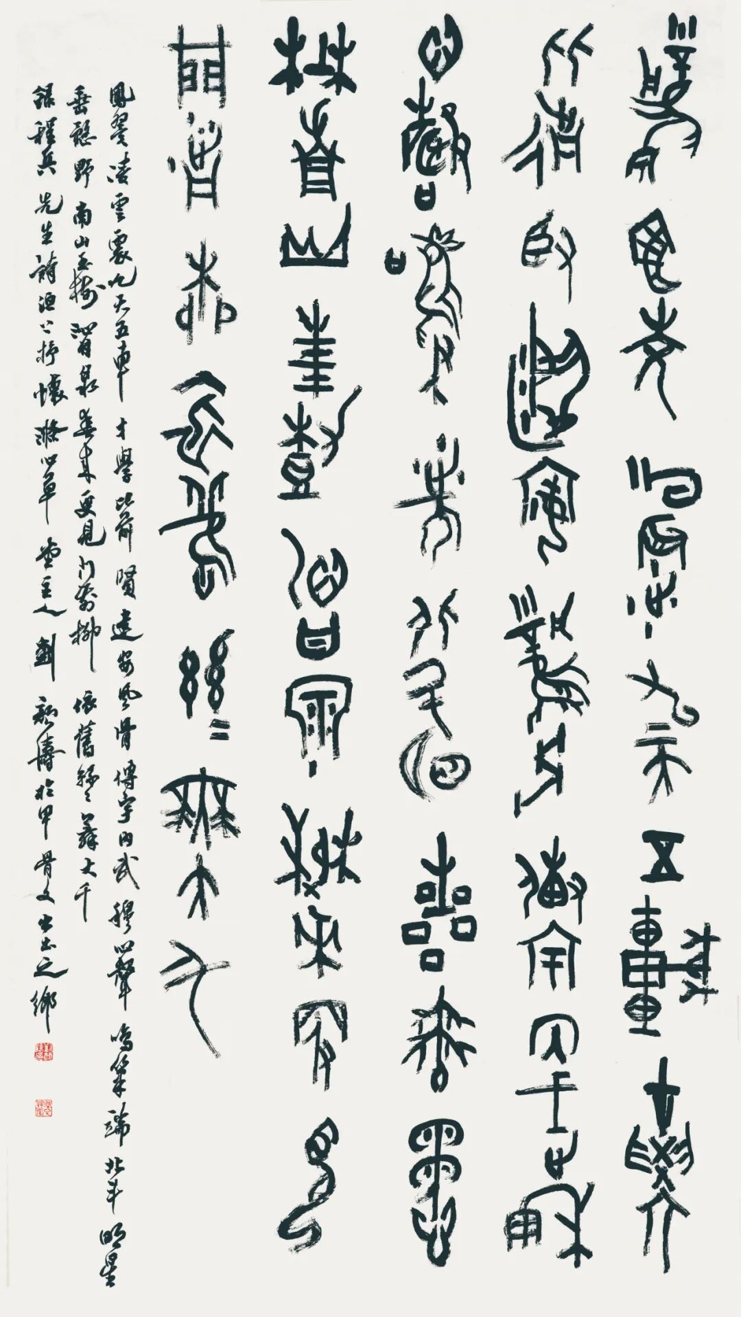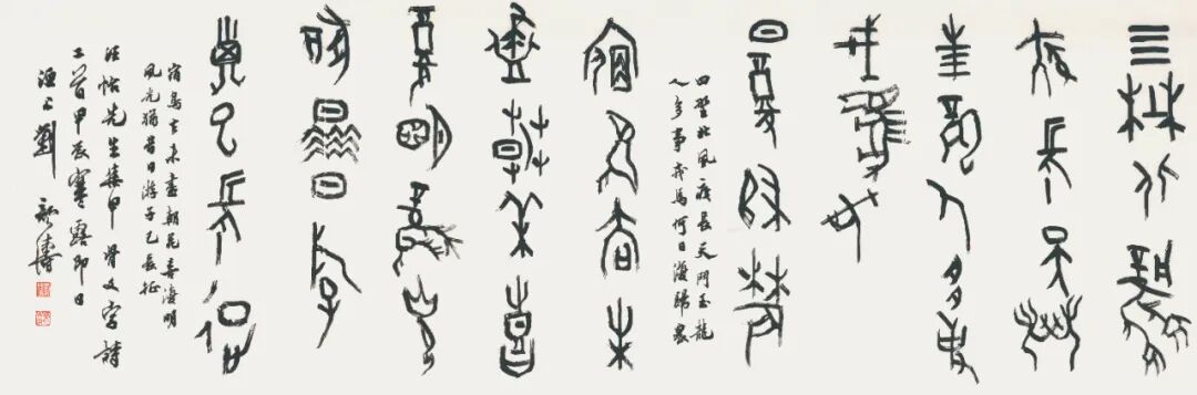 本届拟入围的5件甲骨文作品,一个可喜的特点是多为作者自撰诗、文、联。其中两件长篇自撰诗和文,能在仅千余个常用甲骨文字的局限内,做到文辞雅训、用字严谨,显示了作者良好的文字学与文学修养。众所周知,甲骨文书法创作有两大难:一是“以笔代刀”,在宣纸上既要表现契刻的劲挺精神,又要蕴含毛笔书写的笔墨情趣;二是在有限的可用文字范围内,组织成文,表情达意,且文从字顺。因此,篆书(尤其是甲骨文)创作,无疑是更见综合文化素养与学术功力的书体。