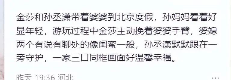 该网友表示,在游玩过程中,金莎主动挽着婆婆的手臂。看上去,婆媳关系和睦。最难得的是,金莎没有明星的架子,在婆婆面前该尽孝的尽孝,做好儿媳妇的本分。孙丞潇的妈妈满脸笑容,她与儿媳妇金莎站在一起看上去年龄相仿。简单而言,她比金莎大不了很多岁。