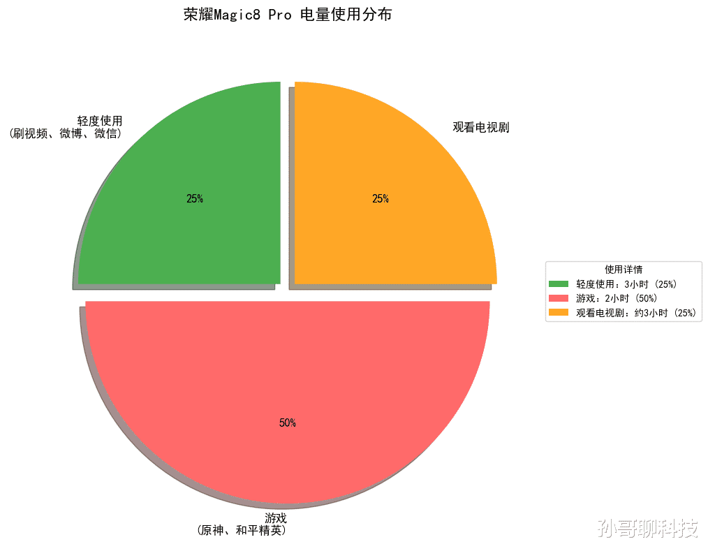 荣耀Magic8 Pro在日常使用中,WiFi+5G切换、亮度拉满、声音开到70%三小时刷视频、微博、微信聊天轻度使用只耗费25%电量,两小时《原神》《和平精英》耗费50%电量,双1216扬声器声音拉到顶观看电视剧8个小时才关机,正常使用一整天没有问题。