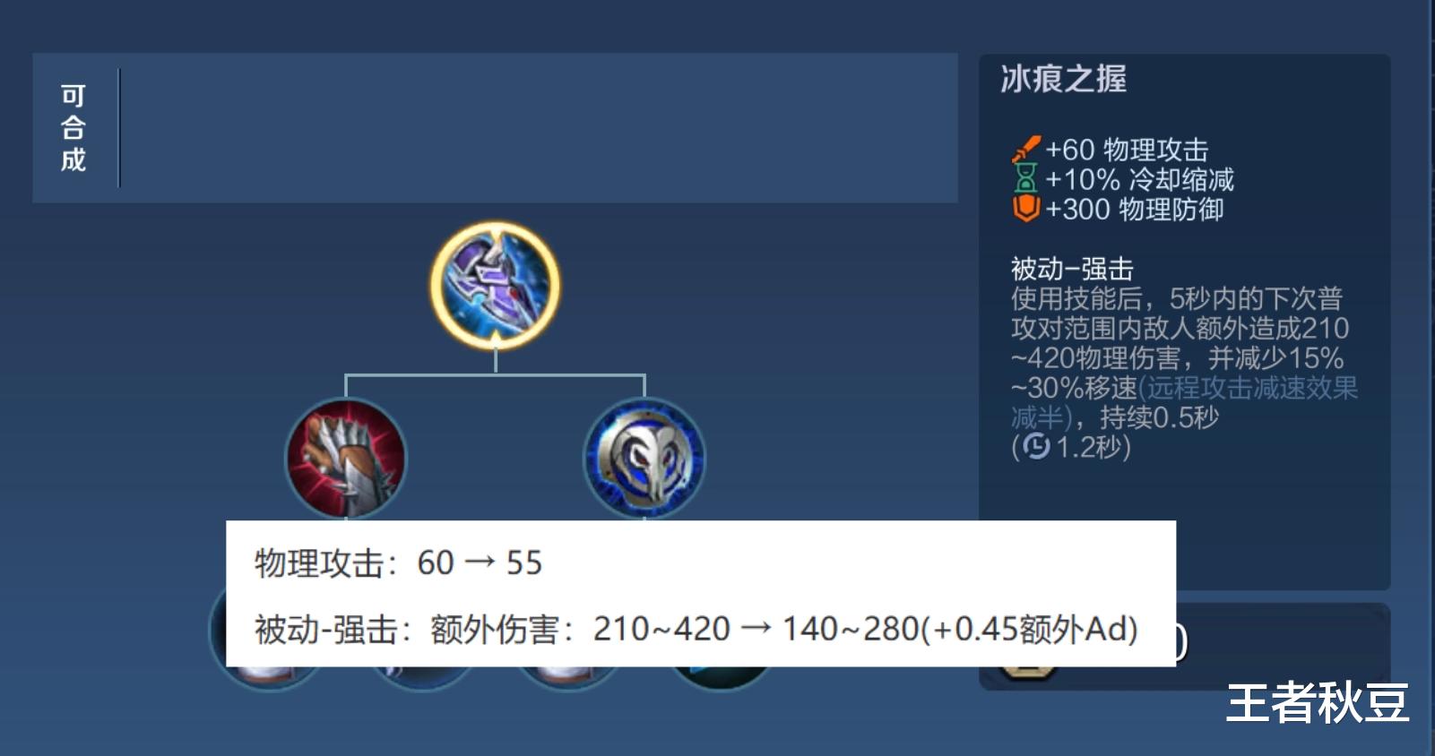 因冰霜巨龙敖隐带火了冰痕之握这件装备,现在是个射手或者对抗路都出冰痕之握。物理攻击调整为55点,和宗师之力变成一样。被动的强击额外伤害基础值降低了70~140点,但是给了0.45额外AD。换上下来也就是312点额外AD是临界点,当额外AD大于312时,属于加强,低于则属于削弱。