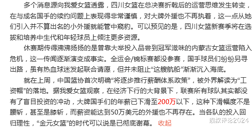 根据媒体人“我爱女篮”的报道,四川女篮新赛季在引援方面已经是比较谨慎,大牌国手们的年薪已下滑至200万以下,这种下滑幅度不是腰斩,甚至是膝斩。