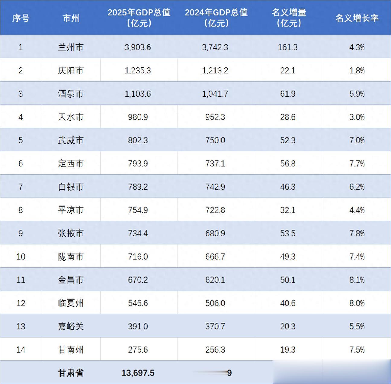 其他城市方面,平凉市、张掖市和陇南市2025年GDP也都超过了700亿元,分别为754.88亿元、734.35亿元和716亿元。其中平凉市虽然总量在张掖和陇南之上,但其名义增长率4.4%却远不及后面两城,接下来若没有更好表现,势必被张掖、陇南反超。