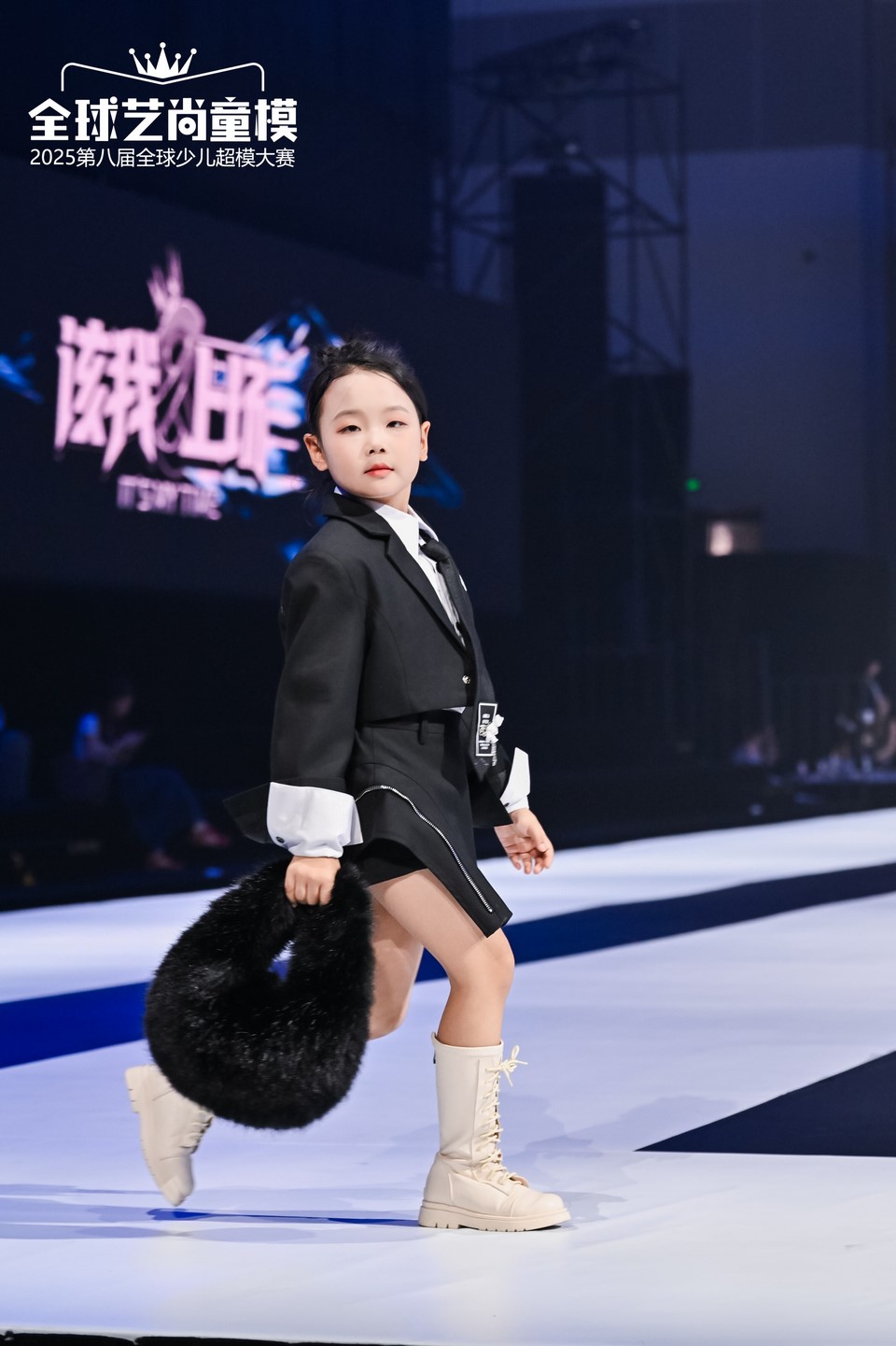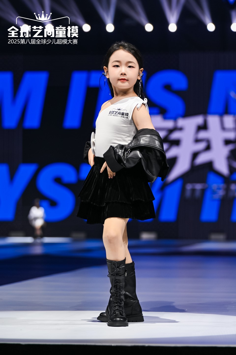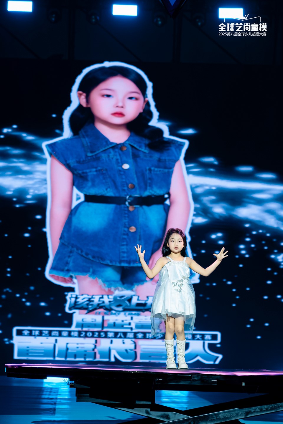 她微微侧身,姿态舒展,将童真与时尚酷感巧妙融合,似要在舞台上演绎一场独特的时尚之舞,为这场大赛拉开充满活力与创意的序幕。
