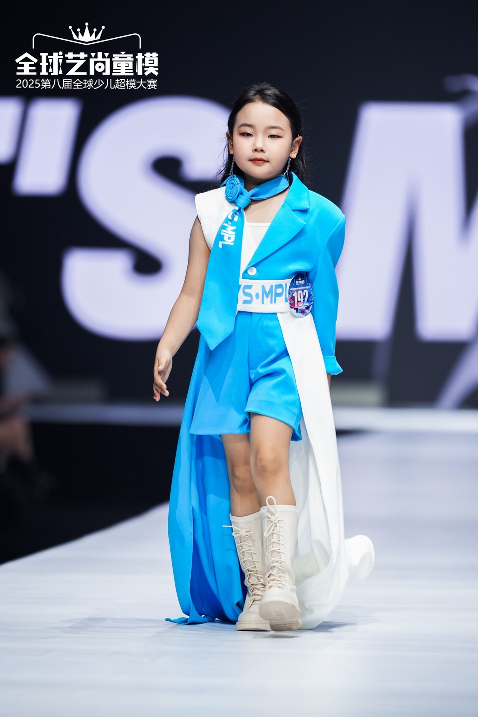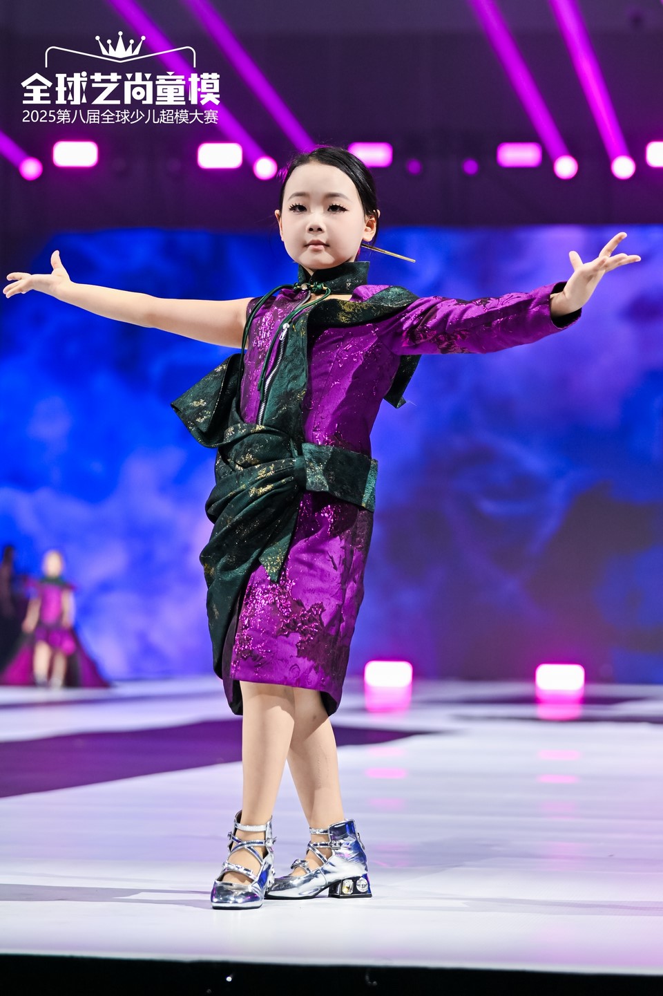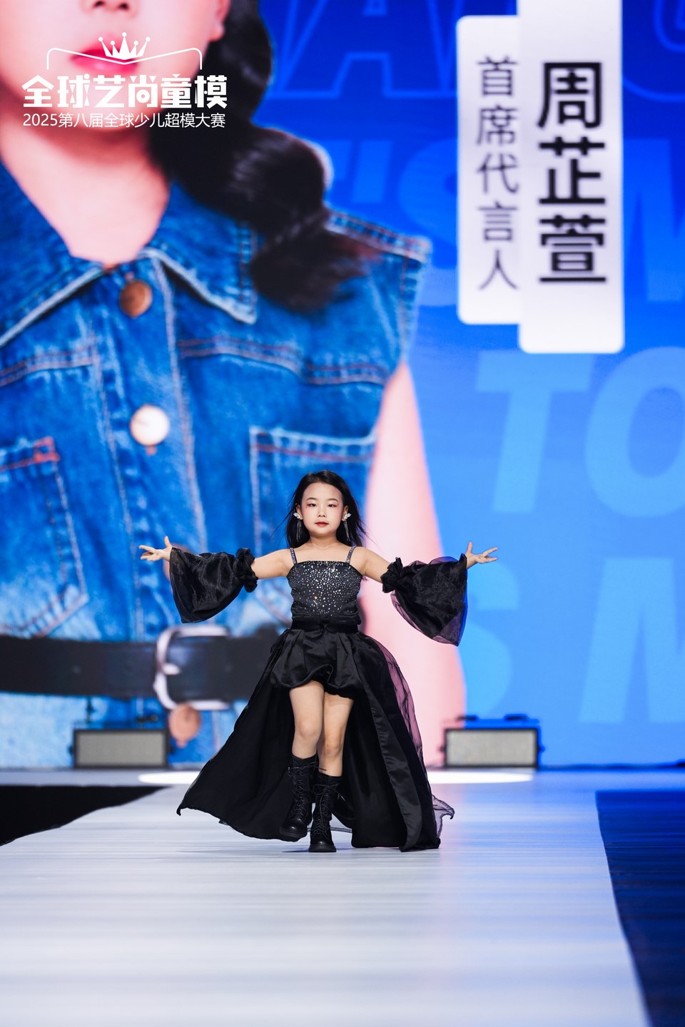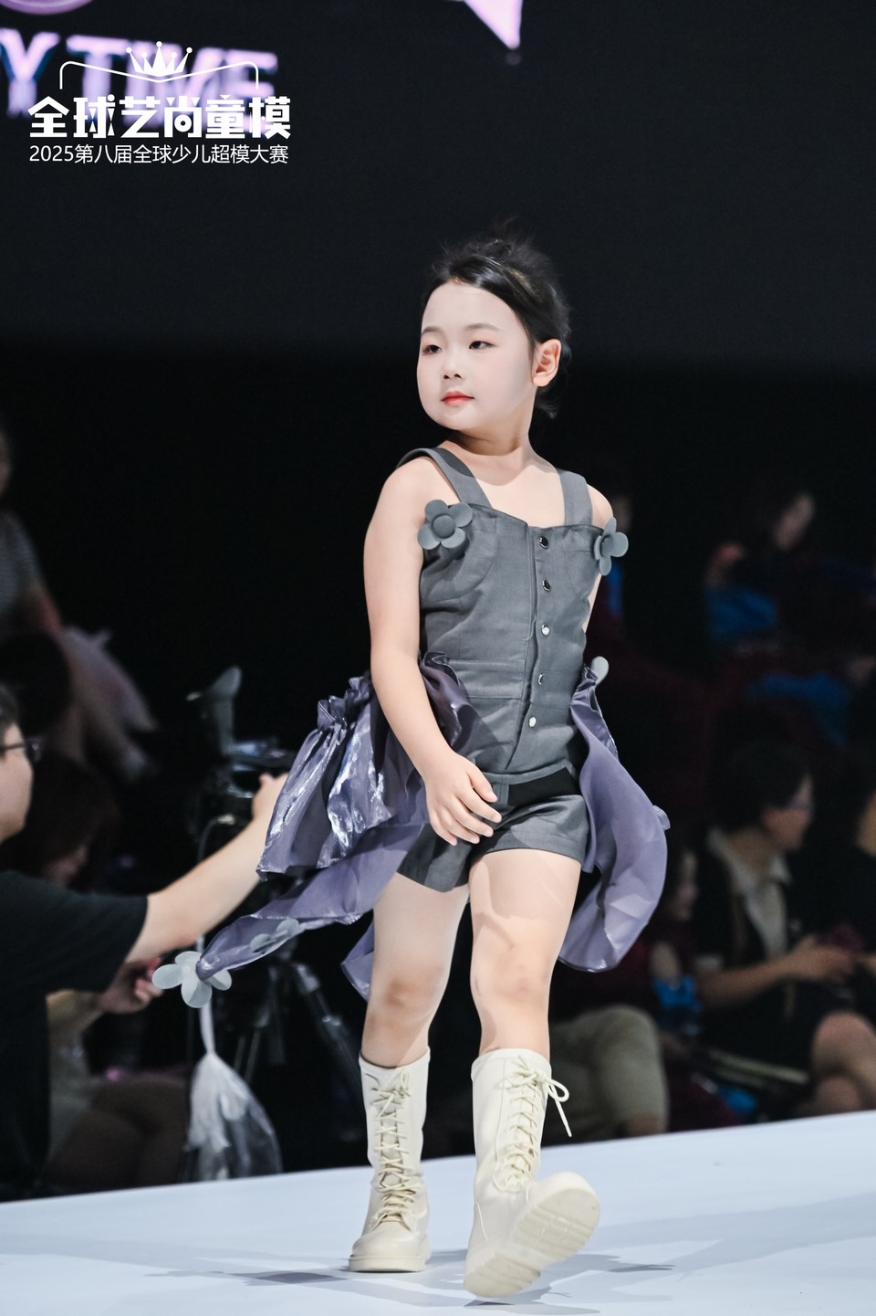 她微微侧身,姿态舒展,将童真与时尚酷感巧妙融合,似要在舞台上演绎一场独特的时尚之舞,为这场大赛拉开充满活力与创意的序幕。