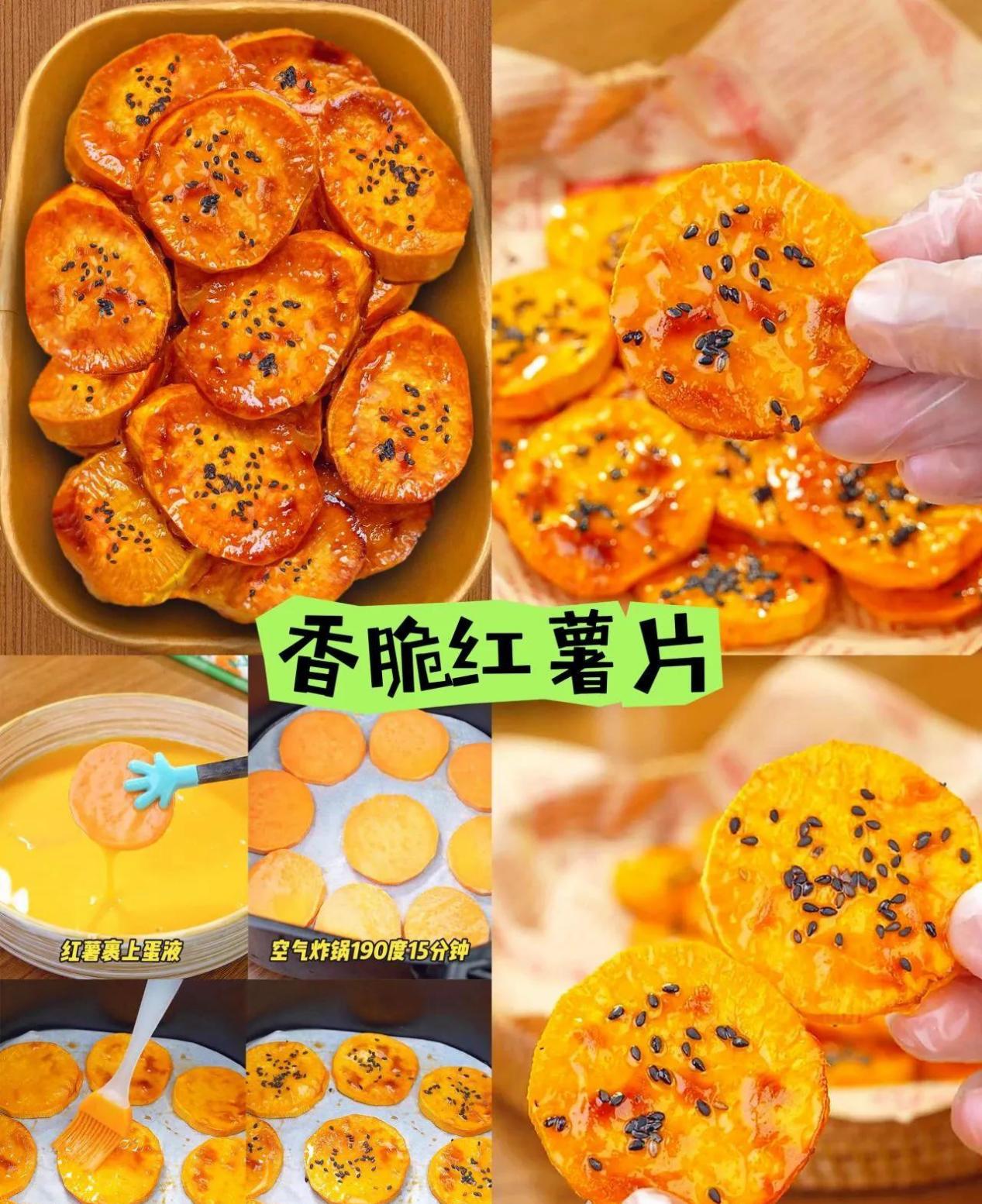 除了烘焙,空气炸锅还能做一些健康的零食,比如香脆红薯片。红薯切片,裹上蛋液和淀粉,放入空气炸锅,180度烤15分钟,中途翻面。最后刷上一层蜂蜜,撒上黑芝麻,再烤3分钟,香甜酥脆的红薯片就完成了。比起油炸,空气炸锅版本的红薯片更加健康,也更方便快捷。