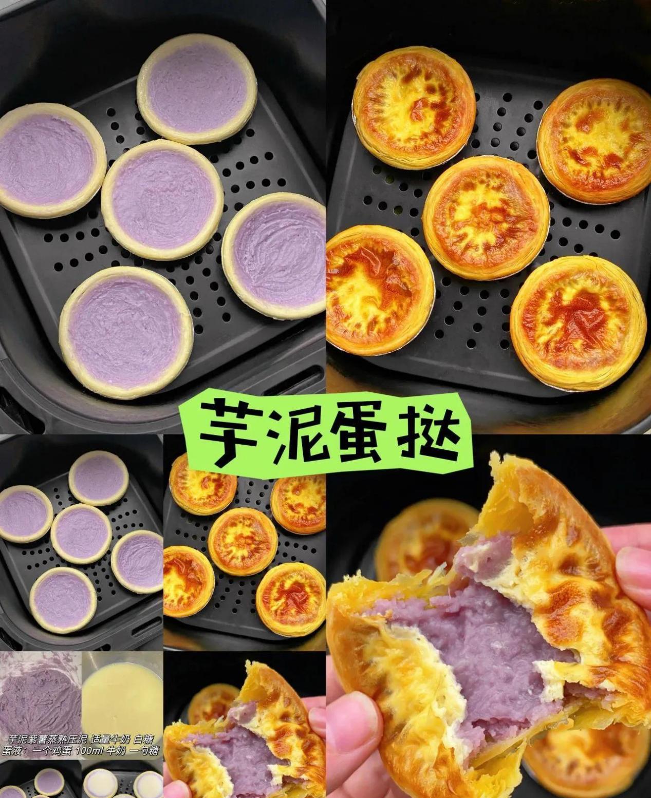 最后,再来一个进阶版的芋泥蛋挞。将蒸熟的紫薯压成泥,加入牛奶和糖,搅拌均匀。制作蛋挞液:鸡蛋液加牛奶和糖混合均匀。蛋挞皮底部铺上一层芋泥,倒入蛋挞液,放入空气炸锅,180度烤15分钟左右。这款蛋挞融合了芋泥的清香和蛋挞的酥脆,口感层次丰富,绝对是让人惊艳的美味。