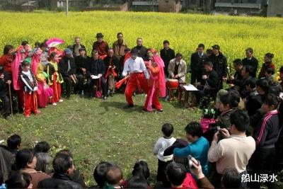 1979年,我从部队回家过年,亲眼目睹了过新年打花鼓,耍狮子的热闹气氛。记得那是正月初四的上午九点左右,打花鼓耍狮子的民间艺人来到我家堂屋里,艺人主持先在堂屋里放了鞭炮,全体艺人,在堂屋中向我爷爷奶奶的遗像前叩了三个头。接着闹新年的演出就开始了,先由耍狮子的人顶着狮子脑袋去我家每个房子(特别是灶屋(厨房))里摇头晃脑的走一圈,嘴里念念有词的说话,说这样驱神鬼,接财神。接着四名化了妆,穿着花鼓戏服装的年轻姑娘,唱着那古老的悠扬的花鼓戏,呈现出国泰民安的节日气氛。队(村子)上来看热闹的人也不少。大约唱了二十分钟左右(他们还得去下一家),民间艺人主持人(一般是男性长者)就开唱:‘’正月里来是新年,打着花鼓来讨钱啦,财主老爷放红包咯”。