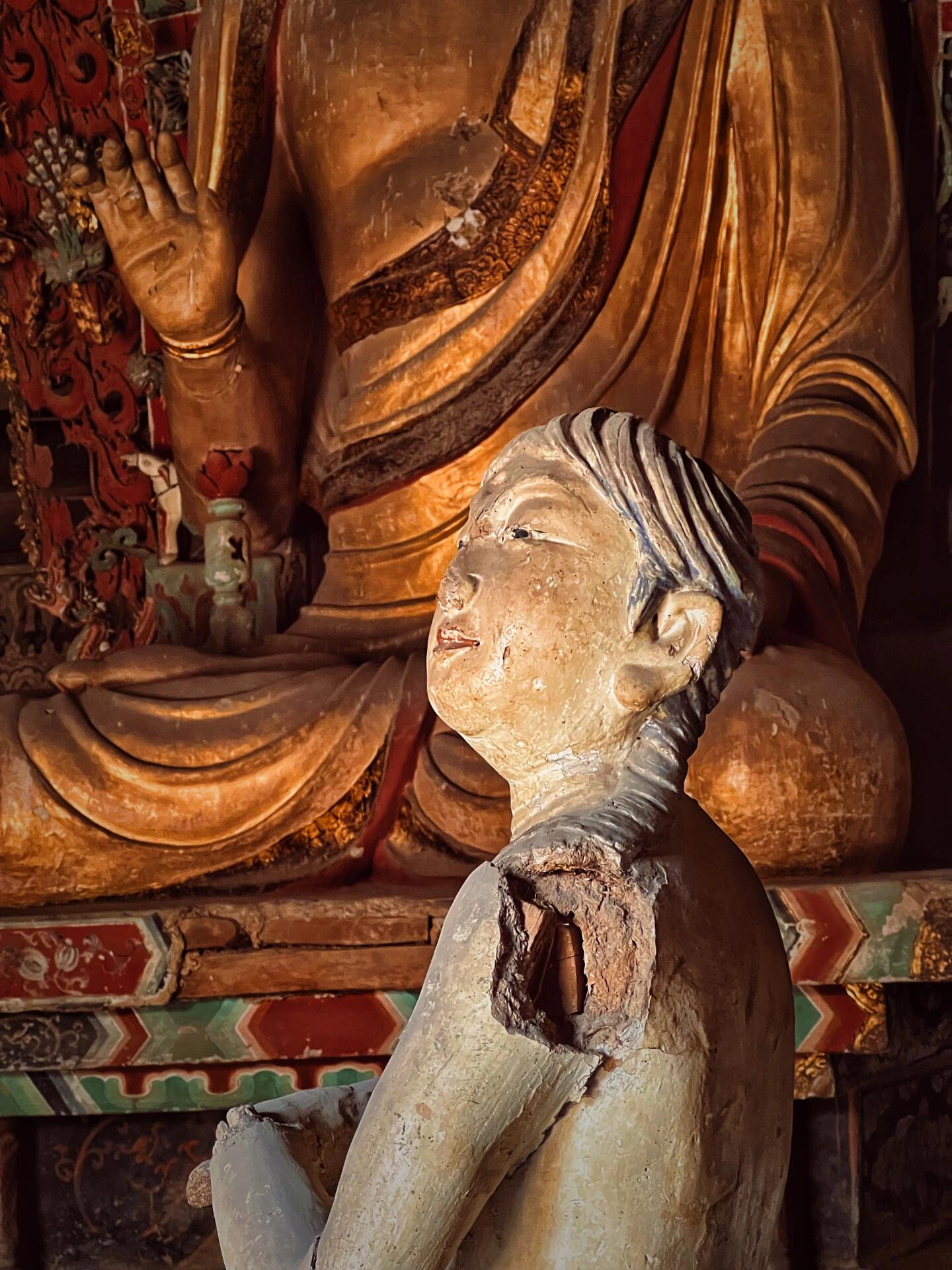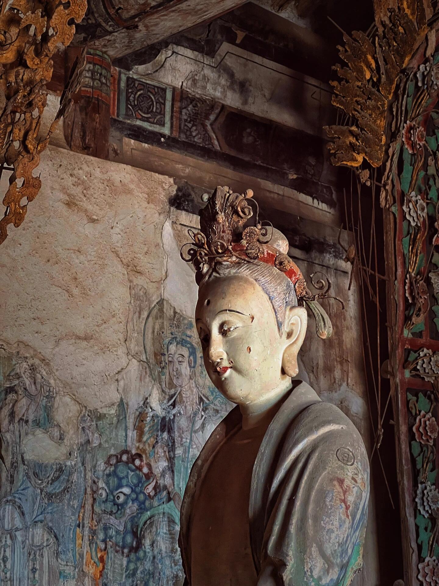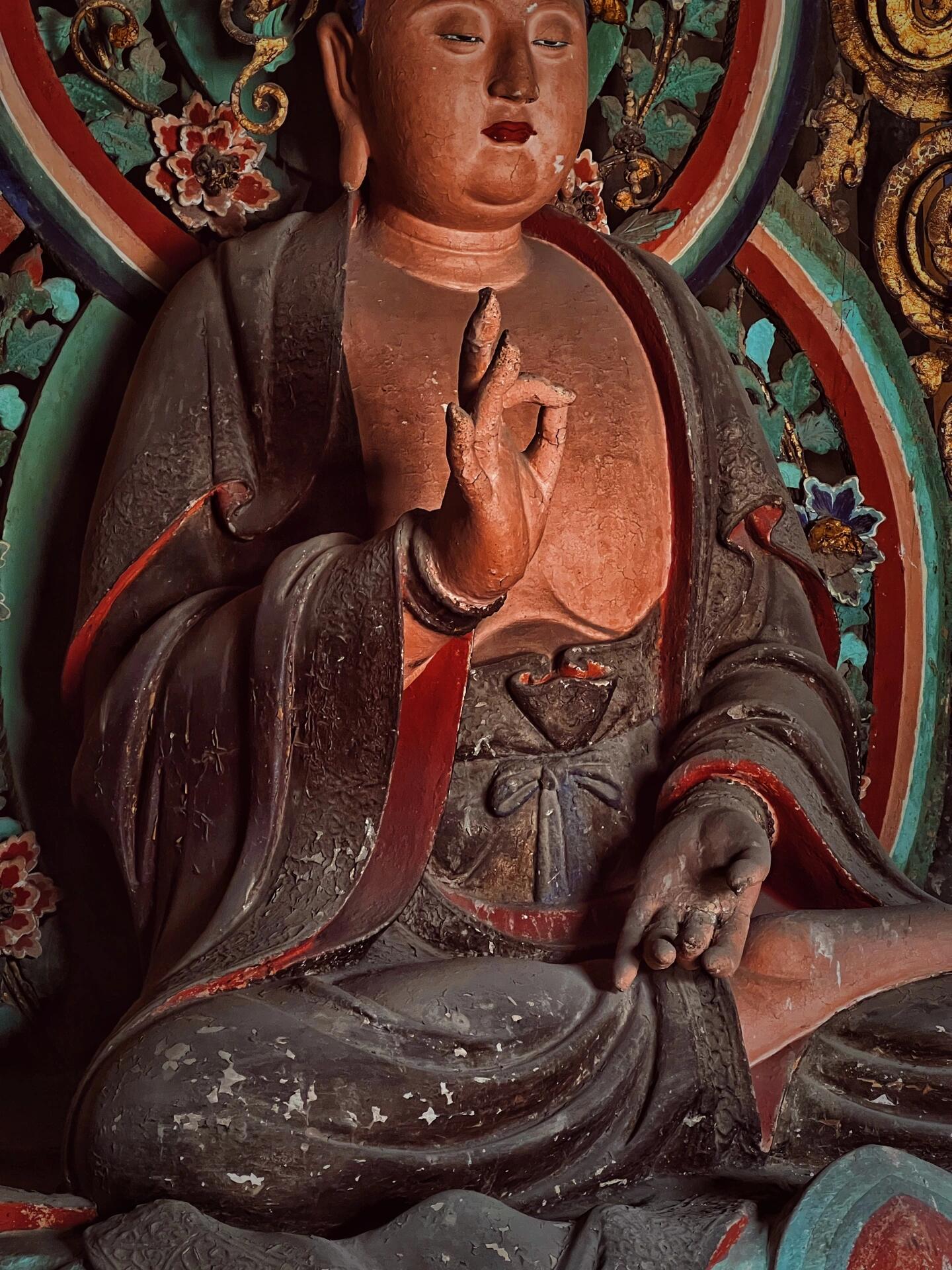 真正让人屏住呼吸的,是殿内的11尊彩塑。它们是目前国内唯一保存完好的五代彩塑作品,历经十余个世纪的岁月,依然保持着鲜活的生命力。居中的释迦牟尼佛结跏趺坐,面容圆润,嘴角微微上扬,既有佛陀的庄严,又透着几分人间烟火气;两侧的弟子、菩萨、天王像姿态各异,有的双手合十虔诚聆听,有的手持法器威严伫立。彩塑的衣纹处理堪称一绝,工匠用简洁流畅的线条,将丝绸、袈裟的质感表现得淋漓尽致,褶皱处仿佛能感受到微风拂过时的飘动。更难得的是,这些彩塑的色彩虽已褪去大半,却反而增添了岁月沉淀的厚重感,斑驳的痕迹恰似历史亲手书写的注脚。