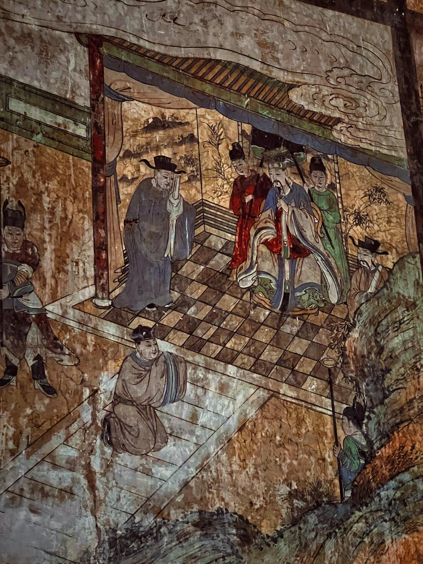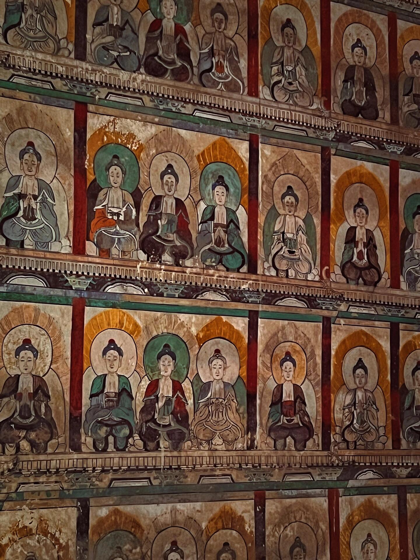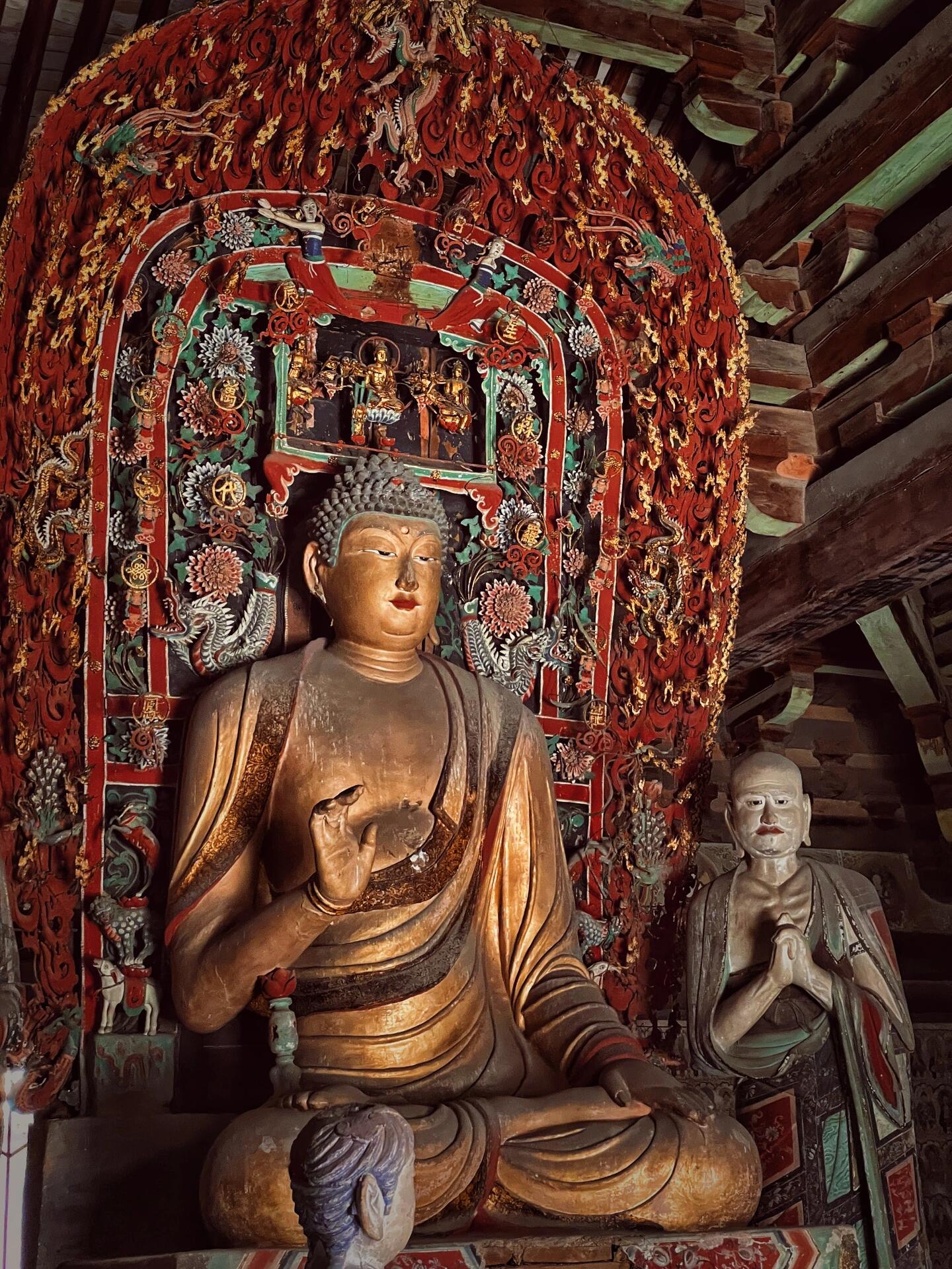 真正让人屏住呼吸的,是殿内的11尊彩塑。它们是目前国内唯一保存完好的五代彩塑作品,历经十余个世纪的岁月,依然保持着鲜活的生命力。居中的释迦牟尼佛结跏趺坐,面容圆润,嘴角微微上扬,既有佛陀的庄严,又透着几分人间烟火气;两侧的弟子、菩萨、天王像姿态各异,有的双手合十虔诚聆听,有的手持法器威严伫立。彩塑的衣纹处理堪称一绝,工匠用简洁流畅的线条,将丝绸、袈裟的质感表现得淋漓尽致,褶皱处仿佛能感受到微风拂过时的飘动。更难得的是,这些彩塑的色彩虽已褪去大半,却反而增添了岁月沉淀的厚重感,斑驳的痕迹恰似历史亲手书写的注脚。