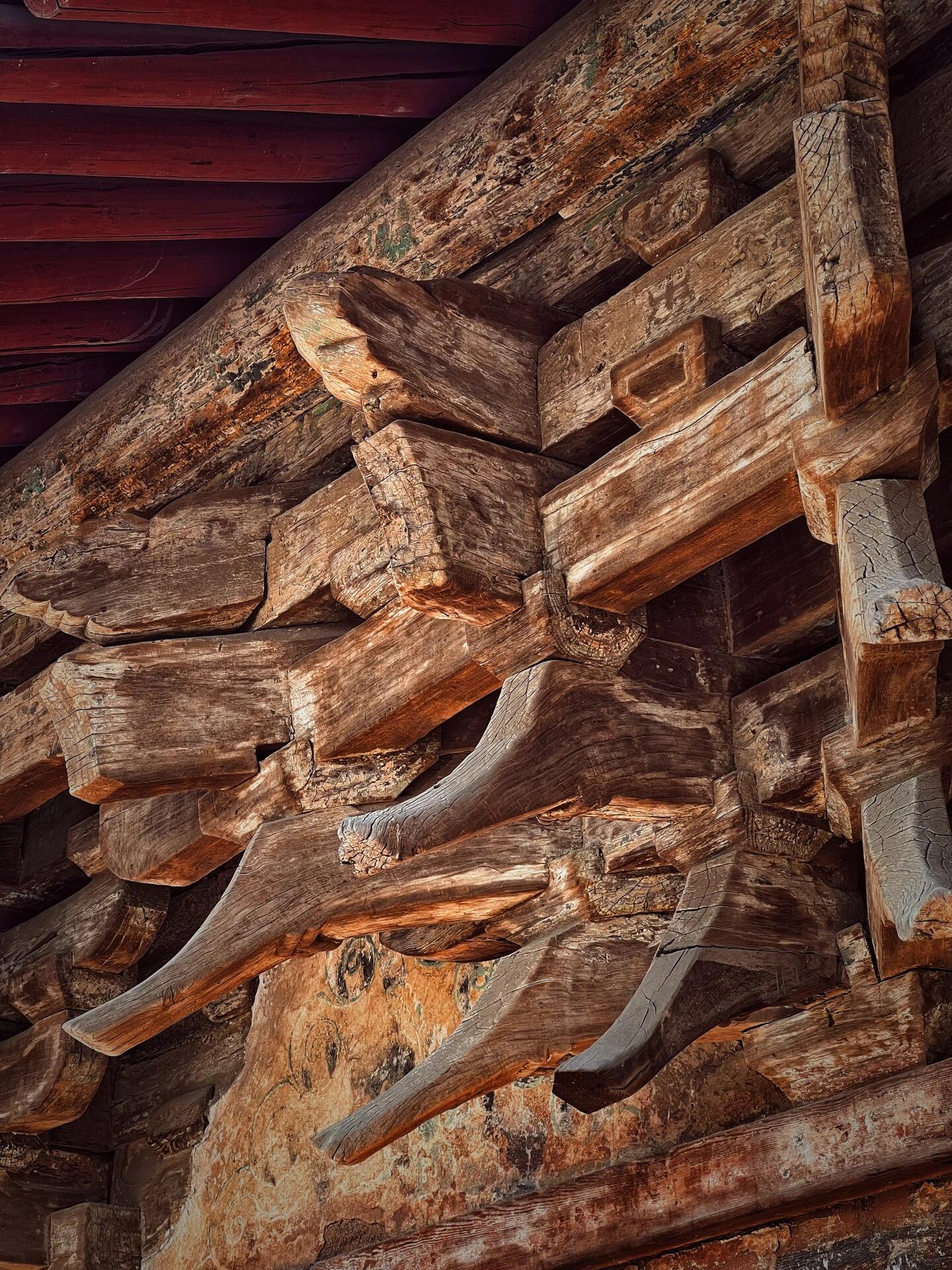 万佛殿的外观并不张扬,单檐歇山顶、面阔三间、进深六椽,体量在古建中不算宏大。但正是这种朴实无华的外表下,藏着建筑史上的珍贵密码。檐下斗拱雄大疏朗,采用五铺作偷心造,每一朵斗拱都如同一座微型的木质雕塑,承托着深远的出檐。不同于后世建筑日趋繁复的装饰风格,五代时期的建筑更注重结构本身的美感与力学逻辑,粗壮的梁架、简洁的线条,处处彰显着那个时代的雄浑大气。