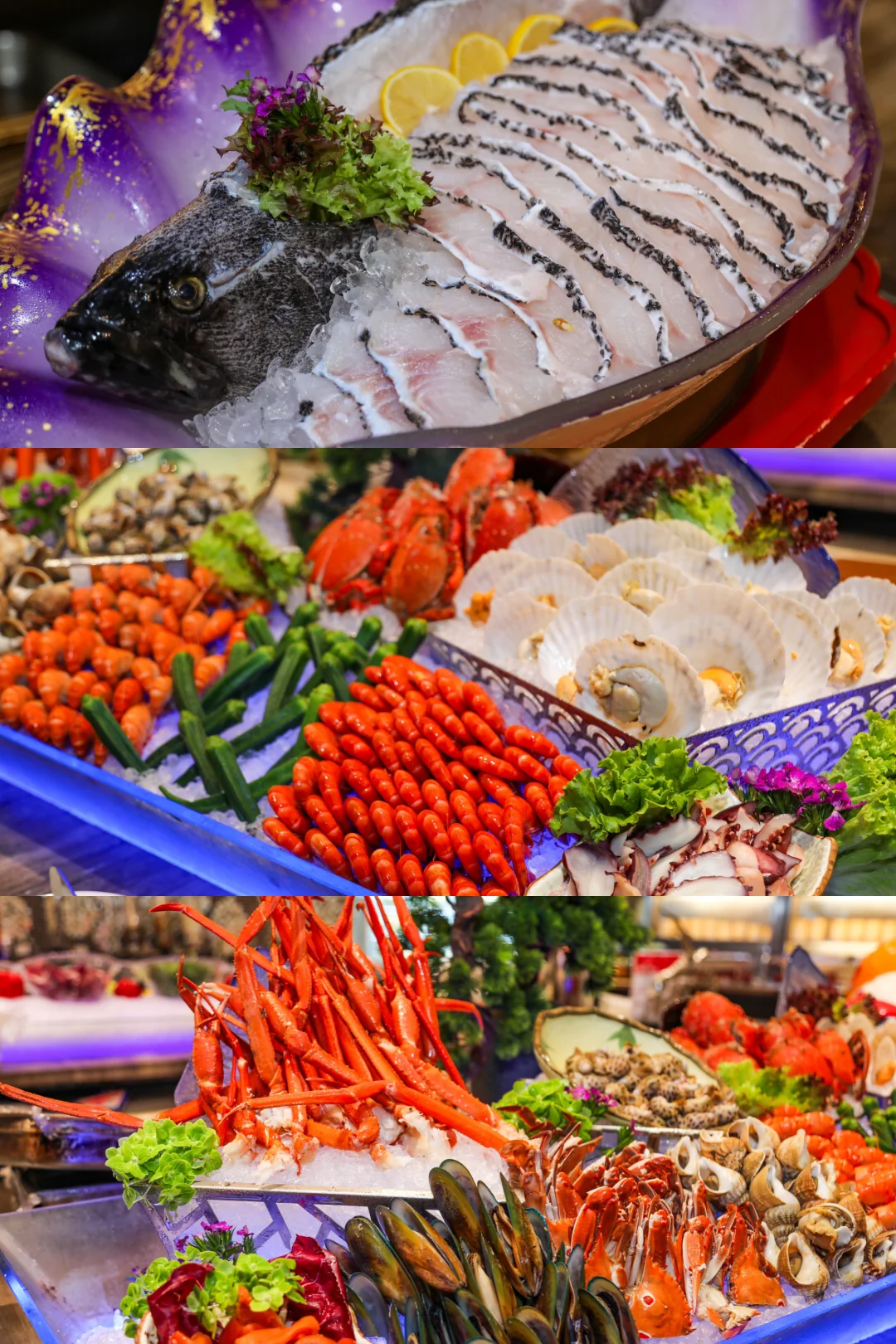 🦀海鲜区:各种生猛海鲜,虾、蟹、贝类、生蚝都超级新鲜,虾的个头很大,肉质紧实弹牙;生蚝肥嘟嘟的,挤上柠檬汁,一口一个超满足。