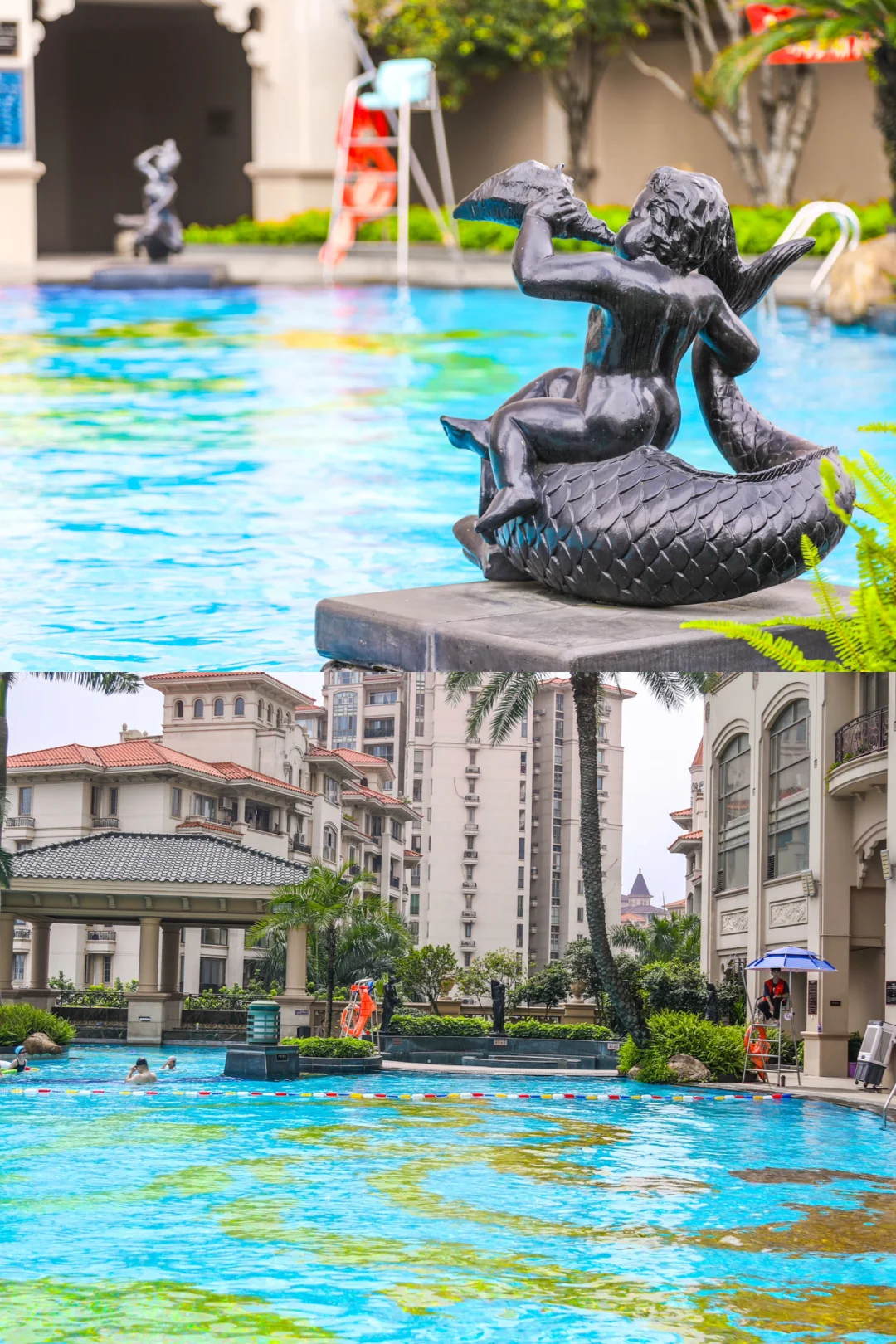这里有室内外双泳池,室外泳池被阳光、绿植环绕,满满的度假风,游完泳在躺椅上一躺,喝杯果汁,太惬意了。