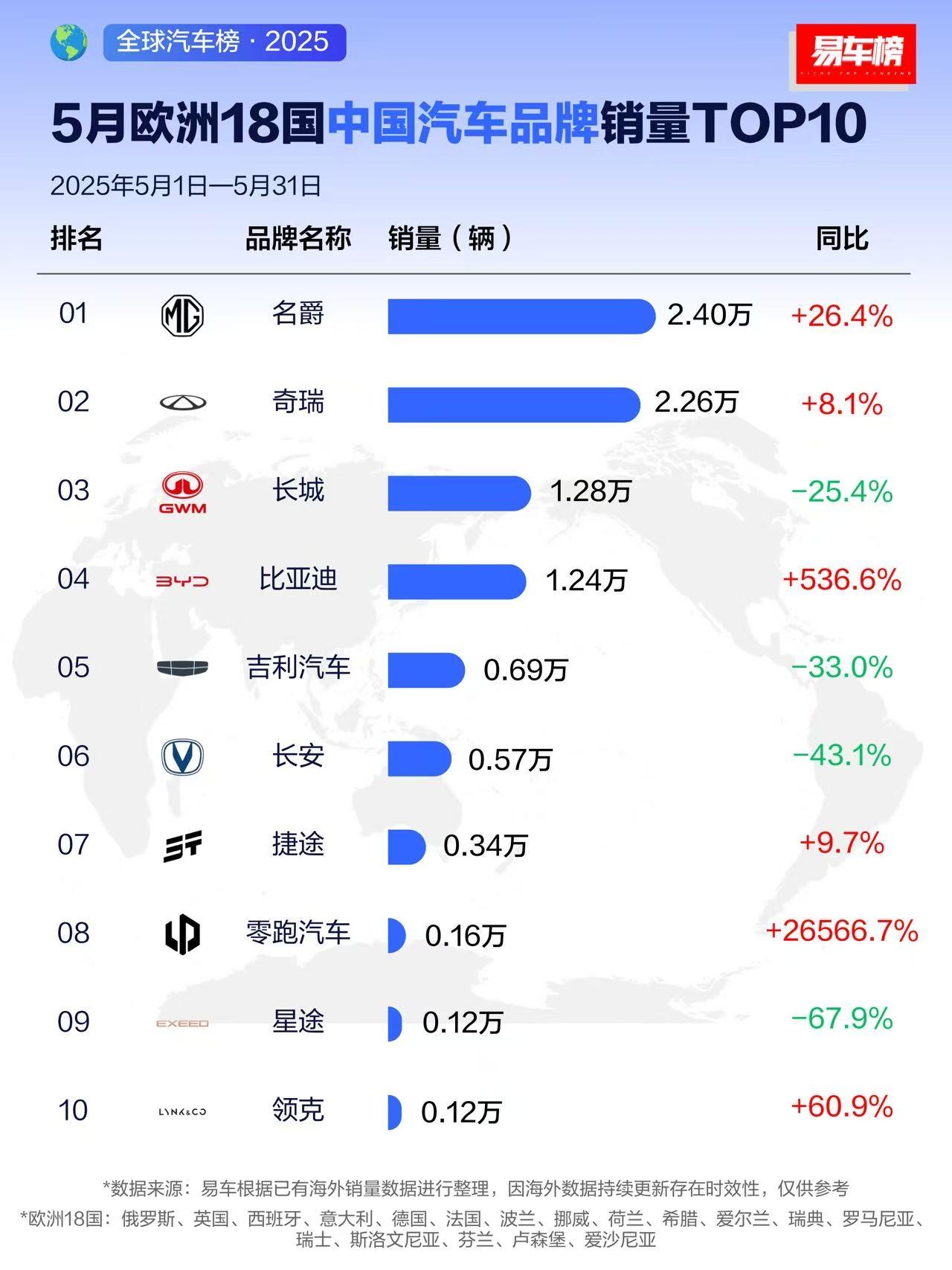 中国汽车品牌在欧洲大放异彩! 刚看到2025年5月欧洲18国中国汽车品牌销量TOP10榜单,真的长脸了! 名爵以2.40万辆的成绩稳居第一,同比增长 26.4%,实力一直在线;奇瑞销量2.26万辆,同比增长 8.1% ,表现也相当稳健。 必须重点夸夸比亚迪和零跑!比亚迪销量达到1.24万辆,同比增长更是高达536.6% ,这增速太惊人了! 比亚迪凭借先进的新能源技术和出色的产品质量,在欧洲市场迅速打开局面,越来越多外国消费者认可比亚迪,这是对中国新能源汽车技术的极大肯定。 还有零跑汽车,虽然销量是0.16万辆,但同比增长26566.7% ,堪称“黑马”。零跑不断创新,用高性价比和智能化的产品,在竞争激烈的欧洲市场闯出了一片天。 此外,长城、吉利、长安等品牌也都有不错的成绩,尽管部分品牌同比有下滑,但它们在海外市场持续耕耘,积累了大量用户和口碑。 相信未来,中国汽车品牌会在欧洲市场取得更耀眼的成绩,让世界看到中国汽车的力量!
