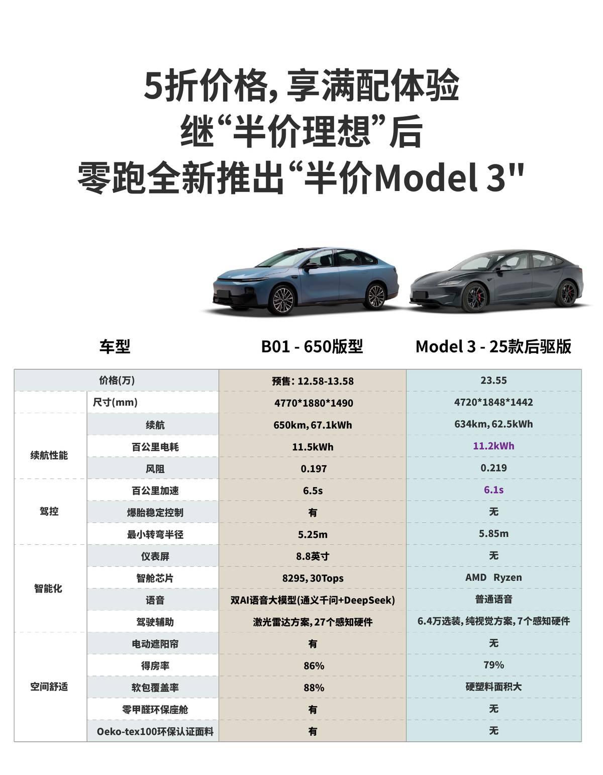 ”半价Model 3“?零跑B01到底如何? 当下的新能源市场,卷价格卷配置已经不稀奇了,但是能卷到越级的还真不多见,甚至能卷到”半价Model 3“都出来了,谁啊?零跑B01呗! 这台车预售价10.58万起,纯电续航650km,如果我们平日出行以上下班为主,再加上周末出行一下,那一周充一次电就够了。而且它18分钟的快充速度,在没电的时候也能够快速补充,基本不费什么时间。就这个续航能力来说,甚至还超越了20多万的Model 3后驱版的634km续航了。 与此同时,B01的智能配置表现也不错,搭载了高通8295旗舰级芯片+双AI语音大模型,既能带来流畅的交互体验,语音助手还能及时响应。并且B01搭载了高通8650高性能芯片+激光雷达端到端大模型辅助驾驶,对比使用AMD芯片和纯视觉方案的Model 3来说,应该也是毫不逊色的。 还有就是Model 3广受好评的驾控方面,在底盘配置上,B01和它都是前麦弗逊+后多连杆的悬架,以及后置电机布局,加速性能也都是6秒级。而且B01的底盘再经由中欧团队联合调校,转弯半径仅为5.25mm,Model 3是5.85米,这是真的让人意外。 所以,B01是”Model 3平替“还真不是吹的,10万级的价格给到20万级的体验。想要买高品质轿车的朋友,B01真的可以认真考虑。 零跑零跑b01零跑B01将于7月下旬上市特斯拉model 3