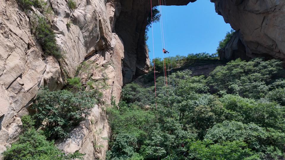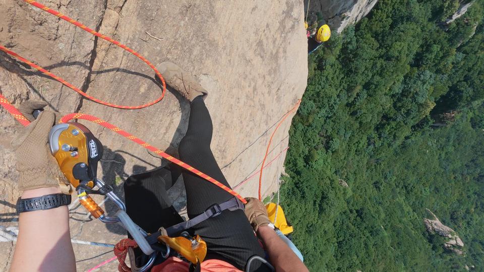 天门山崖降,垂直高度80米,这里风景真的不错,很适合玩绳索,第一次玩这么高的下降,还是有些恐高的。 下降时让有经验的队员进行指导下降,本次崖降的难度是需要过两个锚点。挂短牛尾到锚点上,再解开下降器,第二个锚点是在悬崖边缘,短牛尾不好挂,幸好有其他队友的帮助顺利挂入。 队友也在全程监督操作步骤,在松开下降器时,扳手没有回到位,及时提醒,这是一项高危运动,要随时注意安全。 也看到有些玩崖降的会双手张开进行拍照,我比较胆小,全程都在注意下降的问题。我使用的rig下降器总感觉不太丝滑,松多了太快,松少了不动。 天气实在太热,玩一次就力歇了,感觉都要中暑了,水也带少了。 崖壁绳降 绳索技术崖降 绳索崖降