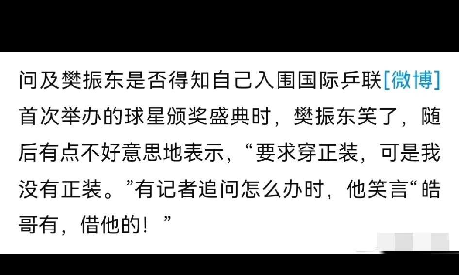 16岁穿西装的小樊同学 2013年巴黎世乒赛前,认真听着王指导的叨叨叨,旁边是仔细给娃,别国徽的吴指导。这是16岁第一次参赛世乒赛,就穿西装打领带的小樊同学。 2014年1月,获得最佳男运动员提名,参加颁奖典礼的小樊同学。