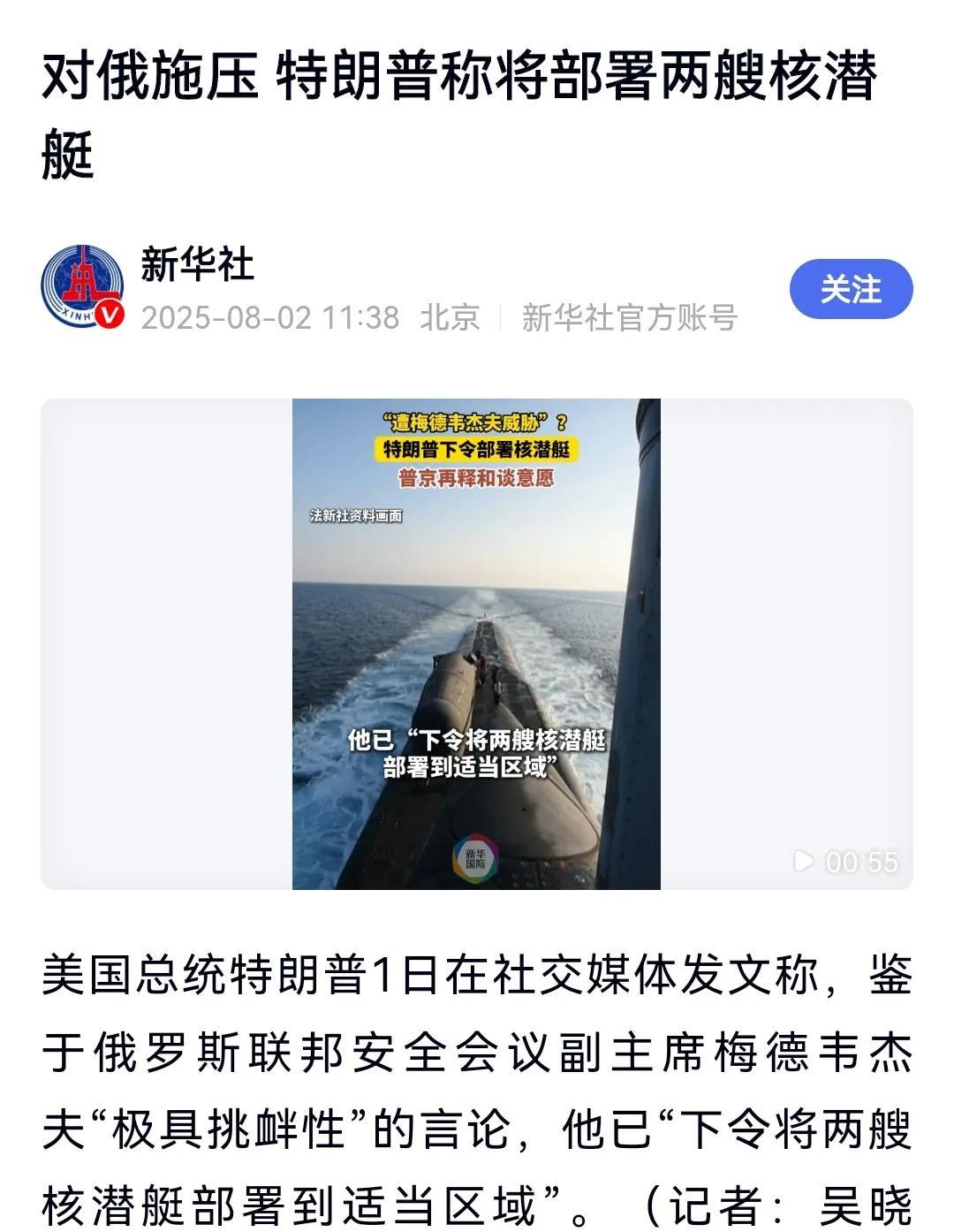 论“嘴炮”功夫,梅德韦杰夫与特朗普不相上下。 前两天特朗普趁着和梅氏斗嘴时,还公布派出两艘战略核潜艇以震慑俄罗斯,而梅氏则反唇相讥,这潜艇难道是派往萝莉岛? 身为堂堂一超级大国的总统,特朗普当然不会因为和别人一番言语冲突,就轻易派出国家战略武器去恐吓对方,他再不“靠谱”,也不至于这么“离谱”。 其实特朗普只是为将来埋下伏笔,毕竟他给俄罗斯留下了12天之内要停火的期限,时间一到,如果俄罗斯不听劝,他必须有所动作,这才是特朗普的真正目的。 特朗普固执、要面子,梅氏偏不给,看样子两人还会继续隔空论战下去。