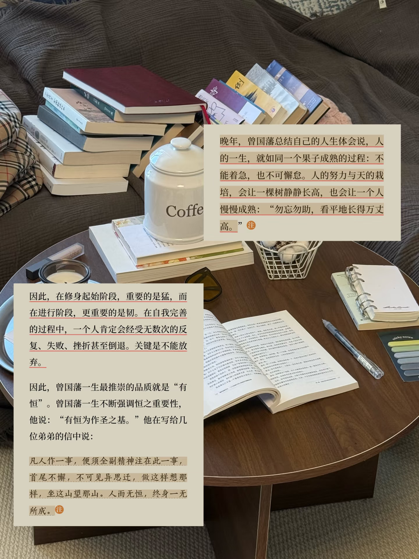 晚年,曾国藩总结自己的人生体会说,人的一生,就如同一个果子成熟的过程:不能着急,也不可懈怠。人的努力与天的栽培,会让一棵树静静长高,也会让一个人慢慢成熟:“勿忘勿助,看平地长得万丈高。 - “每一个人的生命太短,不能经历所有的体验,我们走进别人的故事其实是在延长自己的生命。”再次走进曾国藩的生命,读几页《