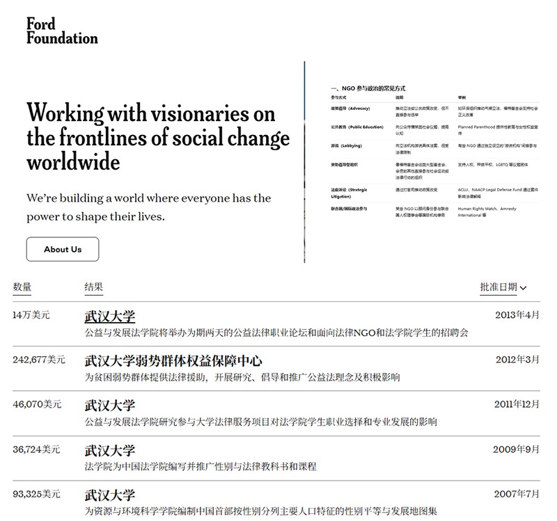 武汉大学被爆长期、大量接受来自美国NGO组织“美国福特基金会”的捐助,援助项目主要为中国法律、性别等方向课题,以下资料查询自“美国福特基金会”官方网站。 数据显示,武汉大学总计获得该组织五次,共计约五十万美元(约合300多万元人民币)的捐助: 2013年4月,14万美元,举办为期两天的公益法律职业论坛和面向法律NGO和法学院学生的招聘会 2012年3月,242,677美元,为贫困弱势群体提供法律援助,开展研究、倡导和推广公益法理念及积极影响。 2011年12月,46,070美元,公益与发展法学院研究参与大学法律服务项目对法学院学生职业选择和专业发展的影响。 2009年9月,36,724美元,法学院为中国法学院编写并推广性别与法律教科书和课程。 2007年7月,93,325美元,为资源与环境科学学院编制中国首部按性别分列主要人口特征的性别平等与发展地图集。 背景:美国长期利用NGO推行其“普世价值”的战略,甚至参与推动其他国家的颜色革命等政治行为,其部分资金直接来自美国政府。 数据来源:美国福特基金会捐助数据库:网页链接(可公开查询)。