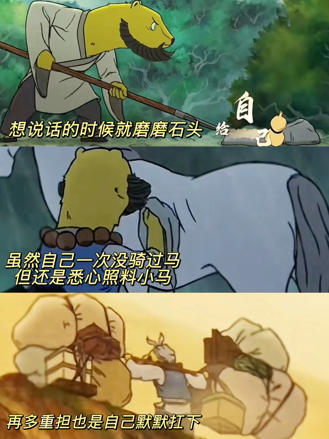 在猩猩学说“齐天大圣”的时候也是黄鼠狼一直在旁边耐心陪伴…他挑着最重的担子毫无怨言,自己从未骑过马但却在角落里帮小马擦着身子…