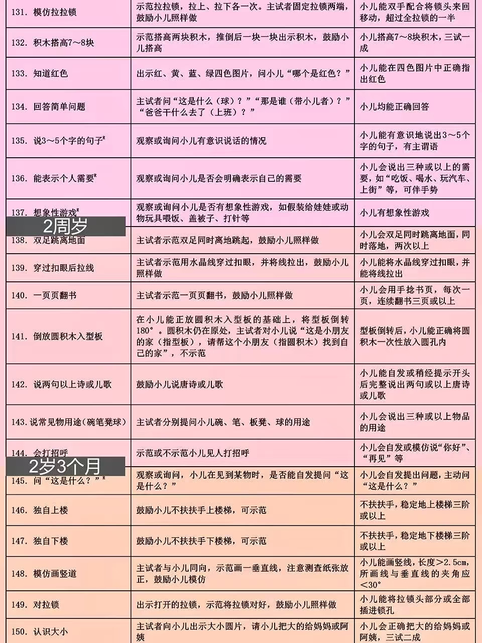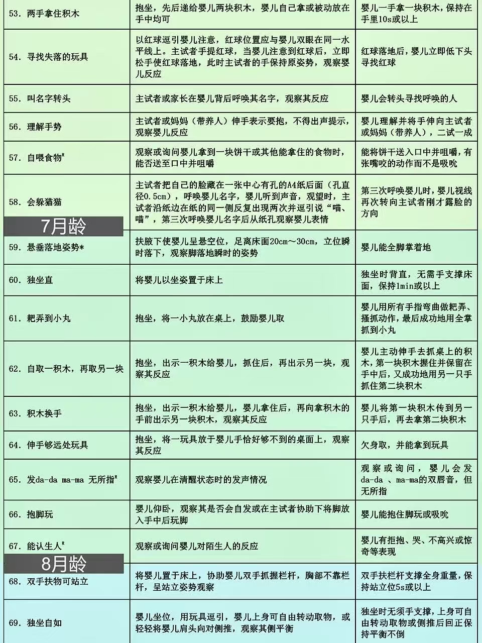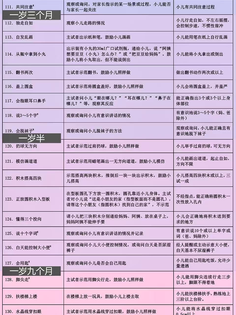 上周带宝宝去做儿保,🧑⚕️医生用的就是这份卫健委出的0-6岁儿童发育行为评估表[搜索高亮]📝 这表格可详细了,按月龄把宝宝应该会的小技能都列出来了,新手爸妈照着这个在家做早教特别方便~ 好多儿童🏥和专业机构都用它,比网上找的杂七杂八的资料靠谱多啦! 🌈已经按月龄用不同颜色区分好了,宝宝现在该会啥、接下来要练啥,一眼就能看清楚,真的超实用!建议收藏起来,随时翻出来对照着做哦~