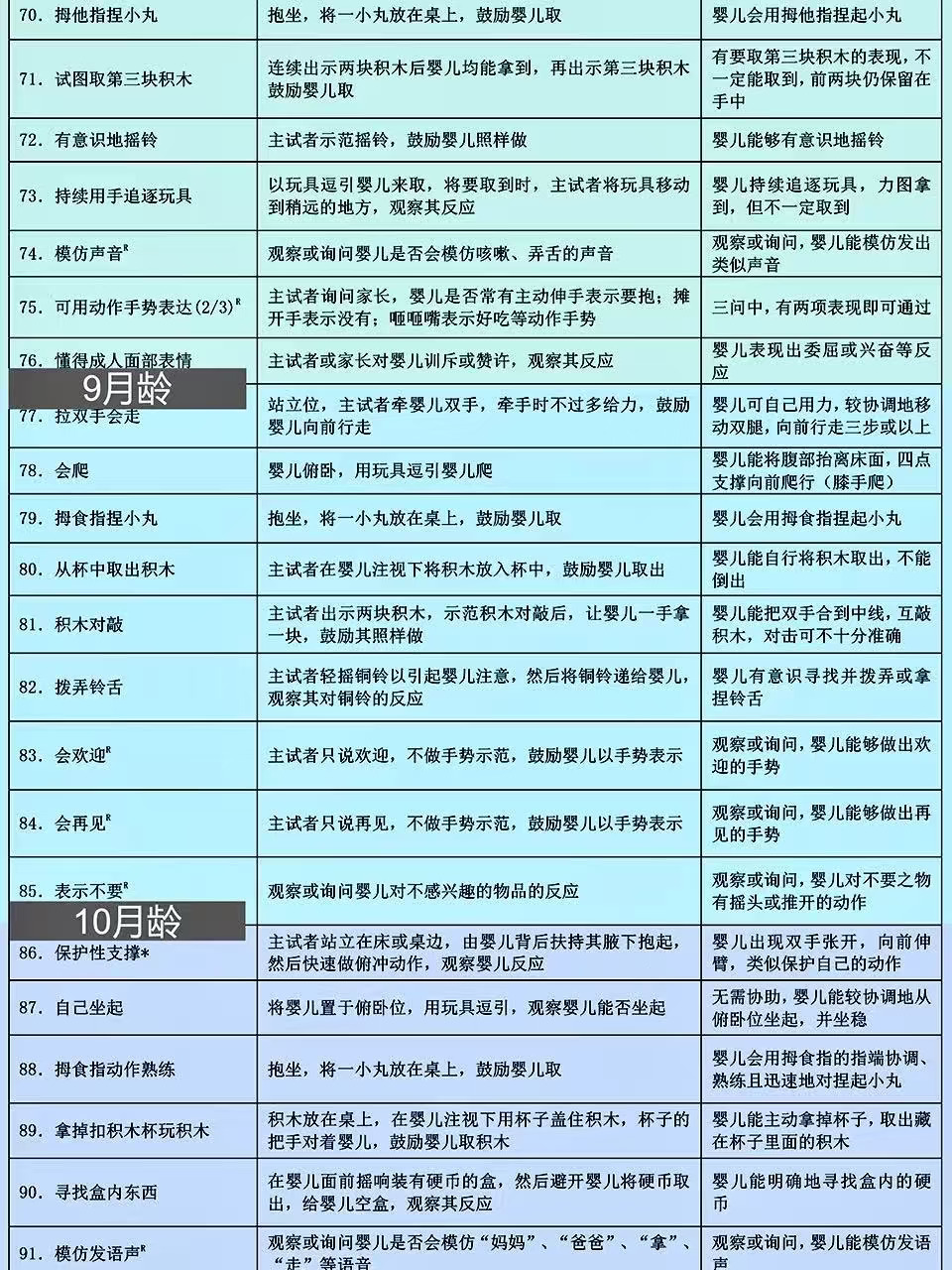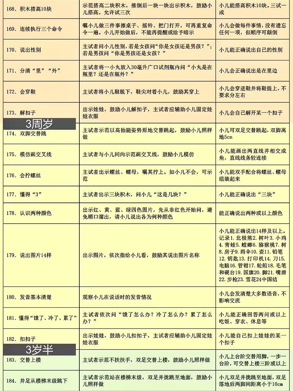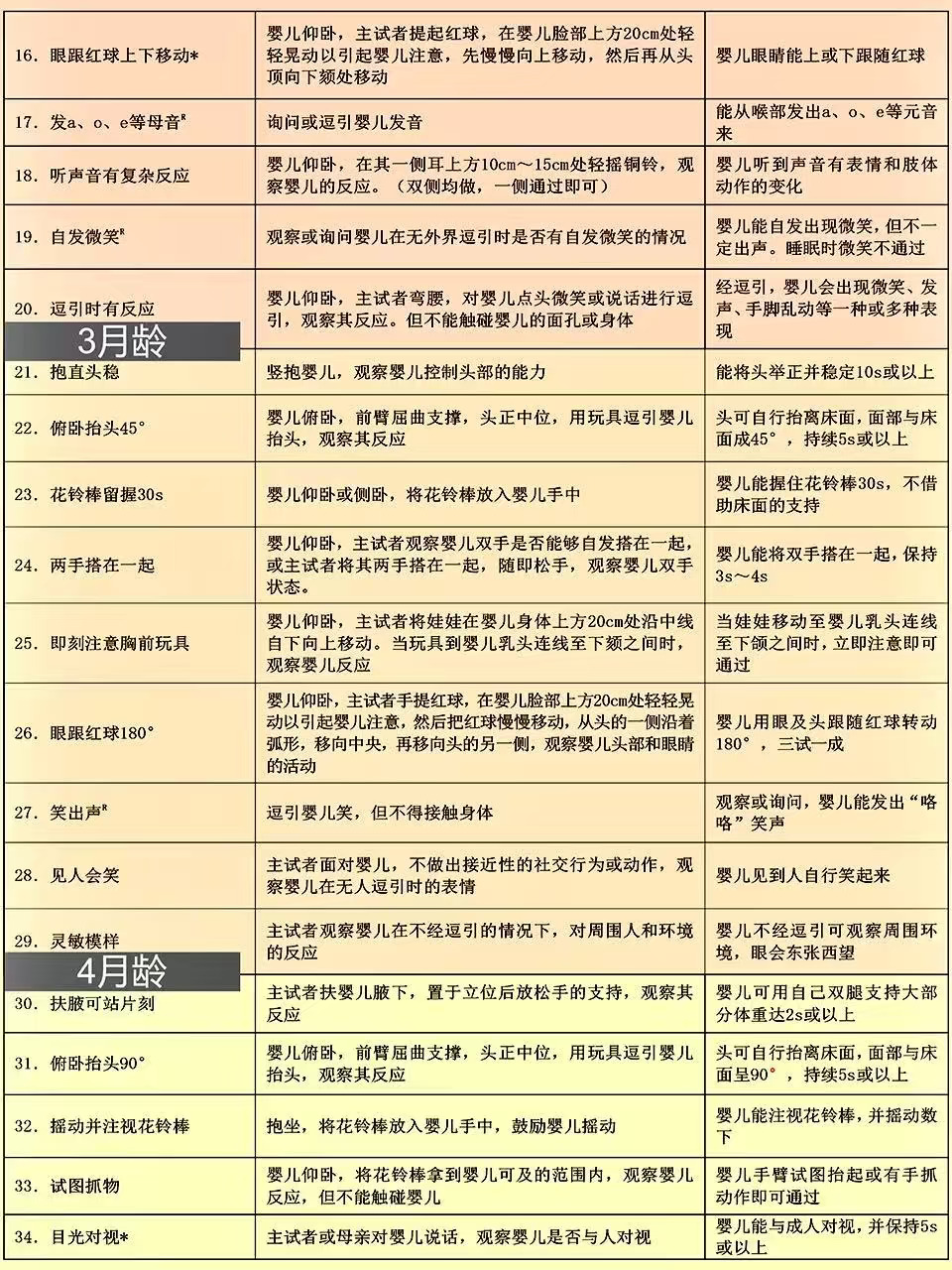 上周带宝宝去做儿保,🧑⚕️医生用的就是这份卫健委出的0-6岁儿童发育行为评估表[搜索高亮]📝 这表格可详细了,按月龄把宝宝应该会的小技能都列出来了,新手爸妈照着这个在家做早教特别方便~ 好多儿童🏥和专业机构都用它,比网上找的杂七杂八的资料靠谱多啦! 🌈已经按月龄用不同颜色区分好了,宝宝现在该会啥、接下来要练啥,一眼就能看清楚,真的超实用!建议收藏起来,随时翻出来对照着做哦~