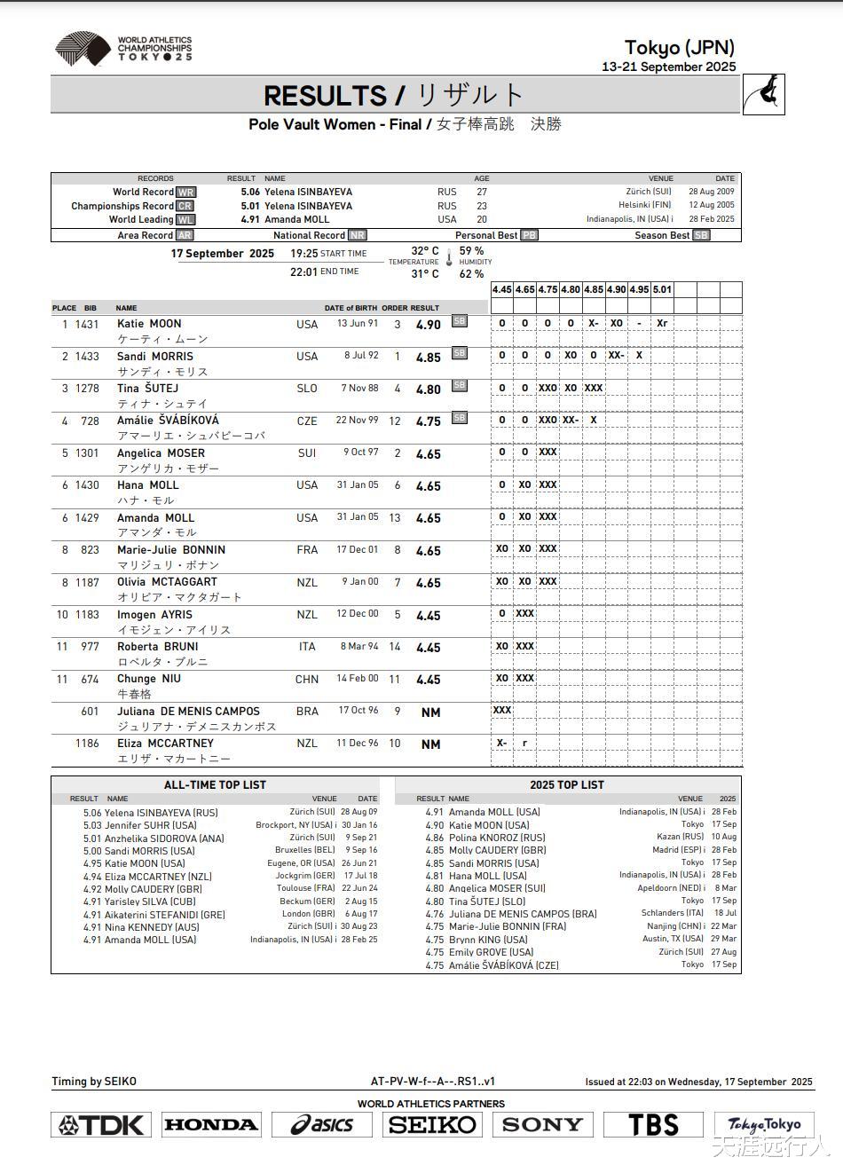 美国包揽前两名,斯洛文尼亚选手摘铜,美国名将凯蒂·穆恩以4米90的成绩成功卫冕,实现世锦赛三连冠,银牌由美国桑迪·莫里斯以赛季最佳4米85获得,铜牌归属刷新赛季最佳的斯洛文尼亚选手苏特(4米80)。