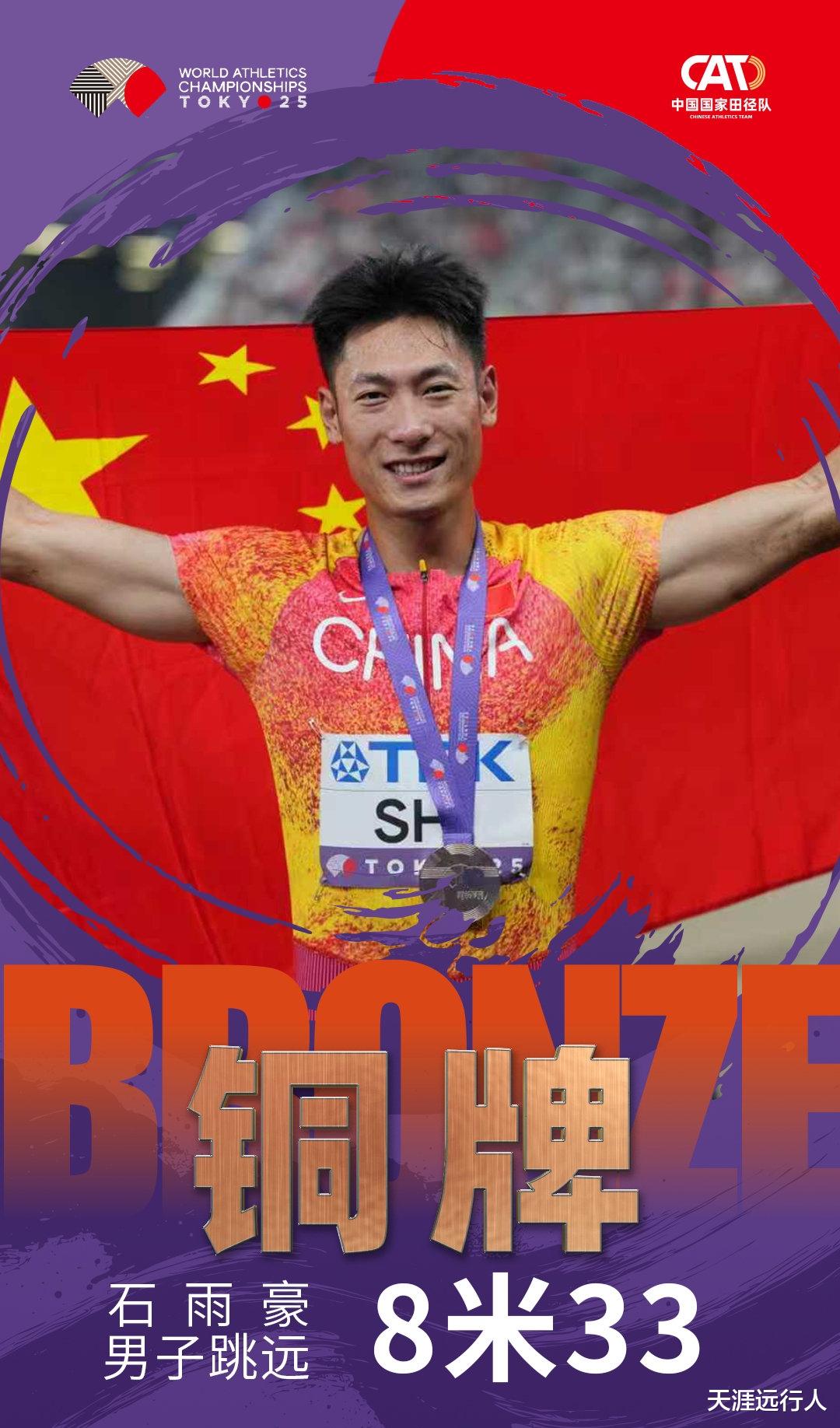 这是他职业生涯首枚世锦赛奖牌,2017年初登世锦赛赛场,石雨豪跳出8米23的成绩,拿到第六名,2018年钻石联赛创下个人最好成绩,2025年,跳出8.33米,夺得世锦赛铜牌。