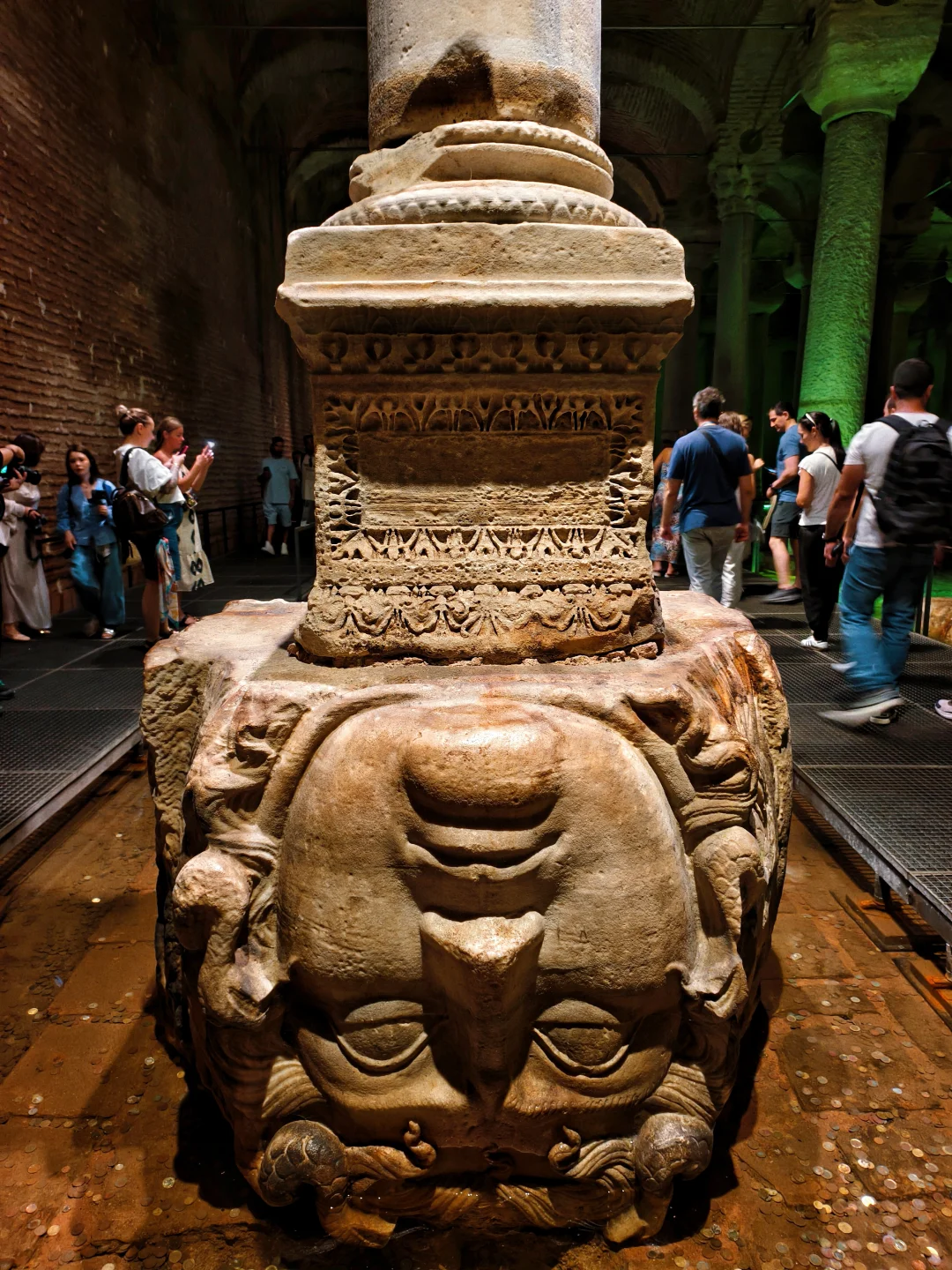 z出名的当然是“美杜莎头像”——两个古希腊雕像做成柱基,一倒一横,据说是为了镇邪。灯光氛围感满分,水面上还有现代艺术装置,冷峻与艺术感兼具,是我喜欢的隐藏打卡地。