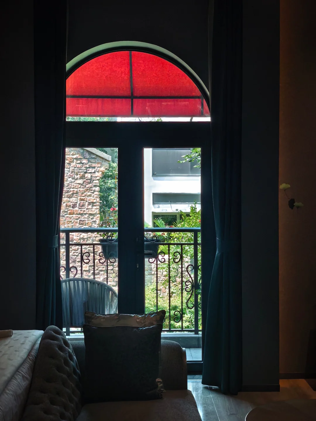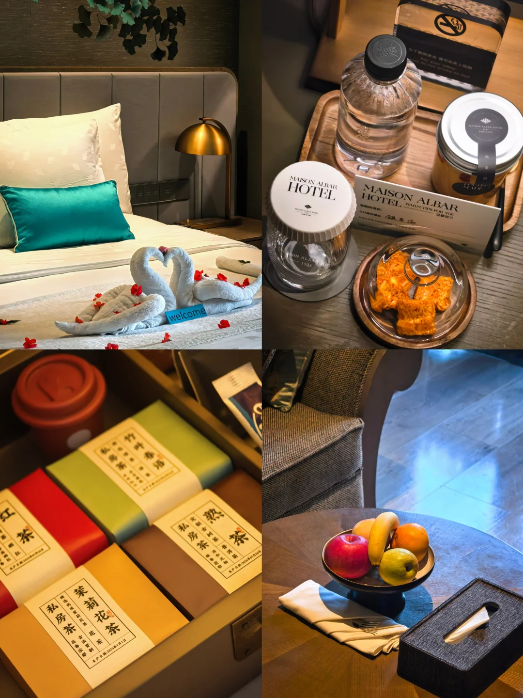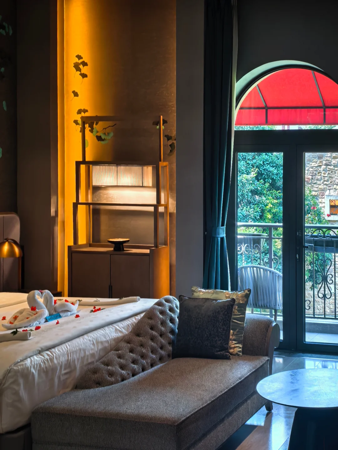 这家的精髓在于漂亮阳台,一定一定要预定带阳台的房型。本次入住豪华露台大床房,房间40多平,窗台做了个圆形拱门,正看麓镇真的非常漂亮,完全感觉穿越到了欧洲。房间墙纸的银杏图案为非物质文化遗产蜀绣工艺纯手工制作,极具在地特色。房间minibar饮品和小食全免费,并且除了欢迎水果,房间还很贴心地准备了蒸汽眼罩,夜床也准备好了小点心和银耳汤。