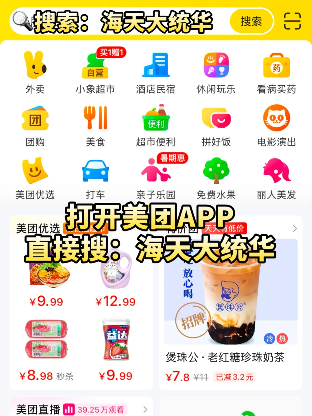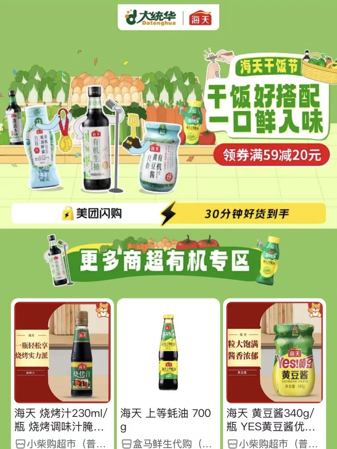 ✨现在上上美团搜【海天大统华】,领券满59减20元;还有10万免单金等你来抢,直接搜【海天干饭节】,买海天大胆开麦赢免单,10万免单金等你来抢!赶紧给家里安排上‼️